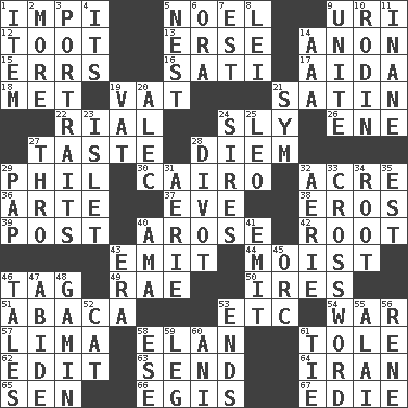 ACROSS 1. Body of Kaffir warriors 5. Christmas carol 9. RI univ. 12. A blast of a horn 13. Celtic language 14. Soon (poet.) 15. Blunders 16. Suttee (variant) 17. Opera by Verdi 18. Was introduced to 19. Large container 21. Smooth fabric 22. Monetary unit of Yemen 24. Mischievous 26. Compass dir. 27. Clothes sense 28. South Vietnam president (1954) 29. Silvers or Donahue 30. Capital of Egypt 32. 43,560 square feet 36. Johnson of "Laugh-In" 37. Night before a holiday 38. Greek god of love 39. Mail 40. Came up 42. Carrot, for example 43. Give off 44. Wet 46. Label 49. Actress Charlotte 50. Angers 51. Phillipine bananalike plant 53. And so on (abbr.) 54. Armed conflict 57. Pale green bean 58. Enthusiasm 61. Lacquered or enameled metalware 62. Prepare for publication 63. Transmit 64. SW Asia republic 65. Elected rep. 66. Armor plate that protects the chest 67. Singer Brickell DOWN 1. A distinct part 2. Greater amount 3. Likenesses of persons 4. ___ a Wonderful Life 5. Egg locale 6. Mouth or opening 7. Eastern Standard Time (abbr.) 8. Flowery wreath 9. Join together 10. "The Thinker" sculptor 11. Empty; void 14. Auto club (abbr.) 19. Large container 20. Actor Baldwin 21. Symbol (abbr.) 23. Small island 24. Male parents of animals 25. Lion 27. Through, poetically 28. A piece of turf (Scot.) 29. Infant food 31. Nest on high 32. Nest on high 33. What you're doing now 34. Carrot, for example 35. Eastern Standard Time (abbr.) 40. Wet nurse (var.) 41. Give off 43. Period 45. The grampus (Milton) 46. Falsehoods 47. Stay 48. Street urchin 52. Feline 53. Conclusions 55. Jai _ 56. French philosopher Descartes 58. Compass dir. 59. Part of a journey 60. Black tropical American cuckoo 61. Neckwear