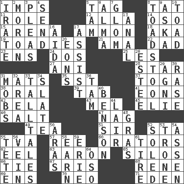 ACROSS 1. Naughty children 5. Label 8. Make lace 11. Hero or heavy, e.g. 12. Silent film actress Nazimova 14. Bear (Spanish) 15. Sports stadium 17. ID or VA city 18. Alias (abbr.) 19. Sycophants 21. Wet nurse (var.) 22. Male parent 23. Followers of ems 24. Two (Sp.) 25. French article 27. Black tropical American cuckoo 28. Play the lead 31. Floor coverings 35. Fast jet (abbr.) 37. Ancient Roman robe 38. Taken by mouth 39. Bar bill 41. Immeasurably long periods of time 42. Actor Lugosi 43. Cartoonist voice _ Blanc 45. Writer Wiesel 46. Table seasoning 47. Tired old horse 49. Beverage made from leaves 51. Title for a knight 52. R.R. building 55. Federal power corp. 57. To separate or throw off 60. Speakers 62. Snakelike fish 63. Composer Copland 65. Grain storage towers 66. Neckwear 67. Indian titles of respect 68. French philosopher Descartes 69. Followers of ems 70. Modern: prefix 71. Locale of original sin DOWN 1. Feeling or showing extreme anger 2. Person of subnormal intelligence 3. Entreaties 4. Post 5. Scottish cap 6. _ mater 7. Take by theft 8. Inedible or poisonous agaric 9. "____ silly question..." 10. Frog relative 13. Of or related to the anus 16. Opera by Verdi 17. Aid 20. Immeasurably long periods of time 26. First name in cosmetics 29. Hindu god of fire 30. Raze (variant) 31. Disorderly crowds 32. Type of rug 33. Baron Munchausen's specialties 34. Schedule 36. Scottish cap 40. Gillaume's butler role 44. Den 48. Pate de foie ____ 50. Caspian sea tributary 52. Having a sole or soles 53. Heavy duty weighing machine 54. NE Netherlands city 55. Wig 56. Distinctive style or manner 58. Merit 59. 4th largest of the Great Lakes 61. Hoop that covers a wheel 64. Bear (Spanish)
