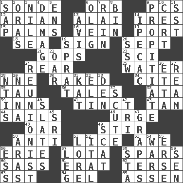 ACROSS 1. Message 6. Globe 9. Personal Computers (abbr.) 12. Believer in; advocate of (suffix) 13. Mountain range southwest of Kyrgyzstan 14. Angers 15. Insides of hands 16. Distinctive style or manner 17. Sweet dark-red dessert wine 18. Ocean 19. Omen 20. Back-to-school mo. 21. Republicans 23. _-fi 24. Rump 25. Wetness 28. Compass dir. 30. Moved through 34. Quote 35. The 19th letter of the Greek alphabet 36. Lies 38. "One Day ___ Time" 39. Taverns 41. Tinged 43. Scottish cap 44. Moves on water 46. Goad 48. Rowing implement 49. Use a swizzle stick 50. Opposed to 51. Louse (plural) 53. Deep reverence 56. 4th largest of the Great Lakes 57. Globular water bottle used in Asia 58. Practice fights 60. Backtalk 61. Part of Q.E.F. 62. Laconic 63. Fast jet (abbr.) 64. Set 65. NE Netherlands city DOWN 1. Plant excrement 2. Mouths or openings 3. The longest river in the world 4. Break 5. Followers of ems 6. Cassini of fashion 7. Precipitation 8. Storage container 9. Appease 10. Sure thing 11. Fast jet (abbr.) 13. Opinion 14. Medicinal drug used to evoke vomiting 19. Small fatty European fish 20. Compass dir. 22. Rowing implement 24. One who advocates reunion 26. Singer James 27. 480, 500 or 516 sheets of paper 28. Nuclear Threat Initiatives 29. Grandmother 31. Krazy ___ of comics 32. Connecticut Ivy Leaguer 33. Lair 37. Scutum 40. Chalkboards 42. Three (prefix) 45. Indian title of respect (Mr.) 47. Raisin fruits 49. Scram, to a cat 50. Caspian sea tributary 51. Old wives' tales, e.g. 52. Slanted text style (abbr.) 54. Armed conflicts 55. Celtic language 56. Curvy letter 57. Part of a journey 58. R.R. building 59. Elected rep.