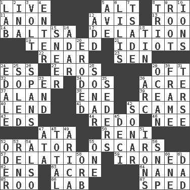 ACROSS 1. Moving, as bait 5. Keyboard modifier key 8. Three (prefix) 11. Soon (poet.) 12. Deliberation 13. Friend of Pooh 14. Greek mezzo-soprano Agnes 17. Accusation by an informer 19. Watched over 21. Foolish or stupid persons 22. Bring up, as a child 23. Elected rep. 24. Double-curved letter 27. Greek god of love 29. Often (poetically) 32. Drug addict 34. Two (Sp.) 36. 1/640 square mile 37. Actor Alda or Thicke 38. Compass dir. 39. Tail end 40. Grant temporary use of 41. Male parent 42. Fraudulent business schemes 43. Begley and Asner 44. Redecorate 46. Born 47. _ moment's notice (2 wds.) 50. Painter Guido (1575-1642) 52. Speaker 55. Motion picture awards 57. Accusation by an informer 59. Pressed 62. Followers of ems 63. 1/640 square mile 64. Nanny 65. Friend of Pooh 66. Experiment locale 67. Moved rapidly DOWN 1. Experiment locale 2. _ tizzy (2 wds.) 3. Electrical Unit 4. Keyboard key 5. "___ Maria" 6. Ms. Damita and namesakes 7. Sadhe (variant) 8. Musical group of three 9. Carrot, for example 10. Charged atoms 12. Find the sum of 15. Contemptuous expression 16. The sixth month of the Jewish calendar 18. Shallow baking pan 20. Worn away 24. Peak District village in England 25. Having a sole or soles 26. Connects, as a bridge 28. Underwater navigation system 29. Sea 30. Movie unit 31. Laconic 33. Conclusion 35. Spring feasts 36. Curve 42. Echolocation 45. Tenth: prefix 47. _ moment's notice (2 wds.) 48. Add up to 49. N. Chile seaport 51. Removes the wrinkles 52. Baltic tributary 53. Western Nevada city 54. In addition 55. Single 56. Fastener 58. Globe 60. Compass dir. 61. June honoree