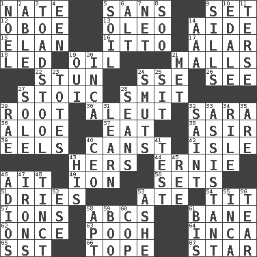 ACROSS 1. Nathan's nickname 5. Without 9. Arrange properly for use 12. Mitch Miller's instrument 13. Margarine 14. Helper 15. Liveliness 16. "Tell ____ the Marines!" 17. Having or resembling wings 18. Directed 19. Lubricate 21. Promenades 22. Make senseless or dizzy 24. Compass dir. 26. Observe 27. Unemotional 28. Stricken, poetically 29. Carrot, for example 30. Eskimo relative 32. "Two Mules for Sister ____" 36. _ vera 37. Ingest 38. SW Saudi Arabia district 39. Snakelike fish 40. 2nd pers. sing. pres. of can (arch.) 42. Capri or Wright 43. Possessive pronoun 44. Bert's buddy 46. Small island 49. Electrically charged atom 50. Puts into a specified state 51. Frees from moisture 53. Had dinner 54. Teat (slang) 57. Charged atoms 58. Lettered men learn these first 61. Object of repulsion 62. Single time 63. "Silly old bear" 64. South American Indian 65. Fast jet (abbr.) 66. Drink excessively 67. Play the lead DOWN 1. Christmas carol 2. Competent 3. Inedible or poisonous agaric 4. Car or cant ending 5. Land 6. Keyboard modifier key 7. Fish or hair follower 8. "Barney Miller" actor Jack 9. Beverly of Met fame 10. Peak District village in England 11. Laconic 14. American Automobile Association (abbr.) 19. Fr. "Yes" 20. South American Indian 21. Was introduced to 23. Hauls 24. Obscenities 25. Be seated 27. Not divided or shared with others 28. Seines 29. Actress Charlotte 31. Memorize 32. Inhabitant of Heaven 33. Helper 34. Cause heat under the collar 35. "We ___ not amused" (Victoria) 40. Corporate head (abbr.) 41. Trial 43. Part of HMS, perhaps 45. Portuguese money of account (variant) 46. Goodbye (Sp.) 47. Removes the wrinkles 48. Colored lightly or faintly 52. Compass dir. 53. American tennis player Robert 55. South American Indian 56. Lacerate 58. Fitting 59. Surprise greeting 60. Police officer (slang) 61. Again