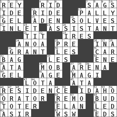 ACROSS 1. Marina Del _, California 4. To free from 7. Droops 11. Binary compound 12. Travel on an animal 13. Chummy 14. Set 15. An important port of Yemen 16. Finds the solution 17. An arm off of a larger body of water 19. Helper 21. Teat (slang) 23. Angers 24. Small Philippine buffalo 25. Before (prefix) 26. _ tizzy (2 wds.) 29. Let have 30. French article 31. Automobile 32. Paper or plastic container 33. French article 34. Compass dir. 35. "One Day ___ Time" 36. Disorderly crowd 37. Sports stadium 40. Set 41. Personal question 42. Wise men 43. Globular water bottle used in Asia 45. _ moment's notice (2 wds.) 46. Home 51. Potato state 55. Speaker 56. San ____ (Riviera town) 58. Partially opened flower 59. Carrier 60. Flair 61. Directed 62. SW Saudi Arabia district 63. Compass dir. 64. Begley and Asner DOWN 1. Swiss mountan, "Queen of the Mountains" 2. Locale of original sin 3. Shout 4. To free from 5. The main thing one is thinking about 6. Cub Scout units 7. Table seasonings 8. Inventor's middle name 9. Small, secluded valley 10. System (abbr.) 12. Food allowance for one day 13. Airs 16. Founders of families 18. Inactive volcano in Sicily 20. Fathers 22. Make lace 24. Therefore, facetiously 25. Military trainee 26. Ancient Celtic tribe of eastern Britain 27. Grandmother 28. "We ___ not amused" (Victoria) 29. Yard entry 32. Paper or plastic container 33. Utah city north of Ogden 36. Mother 37. Nanny (var.) 38. Food allowance for one day 39. Mild oath 43. 61 cubic inches 44. Scent 46. Roll call or roster of names 47. Greek god of love 48. Suttee (variant) 49. Ship's personnel 50. Snakelike fish 52. Competent 53. Became colored 54. Probability 57. Opening into something insatiable