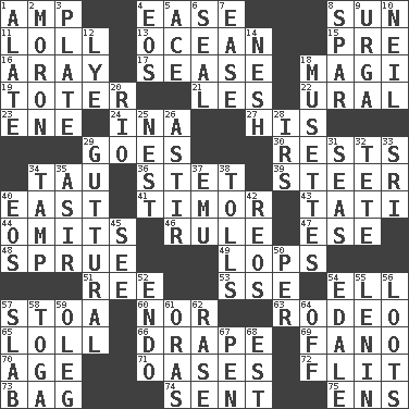 ACROSS 1. Electrical Unit 4. Relaxation 8. Player for Phoenix 11. Hang loosely or laxly 13. Sea 15. Before (prefix) 16. Like ___ of sunshine 17. Gospel singer Marvin 18. Wise men 19. Carrier 21. French article 22. Mountain range 23. Compass dir. 24. _ tizzy (2 wds.) 27. Part of HMS, perhaps 29. Leaves 30. Musical pauses 34. The 19th letter of the Greek alphabet 36. Proofreading order 39. Guide 40. 90 degrees 41. Southeast Indonesia island 43. Jacques of French films 44. Leaves out 46. Court order 47. Compass dir. 48. Upset 49. Chops off 51. To sift 53. Compass dir. 54. Pipe bend 57. Portico 60. And not 63. Cowboy competition 65. Hang loosely or laxly 66. Window treatment 69. Papal veil 70. Personal question 71. Fertile tracts in a desert 72. Secret move to avoid paying debts 73. Container for groceries 74. Emitted 75. Followers of ems DOWN 1. Having winglike extensions 2. Person of subnormal intelligence 3. Food holder 4. Greek goddess of the dawn 5. Adept person 6. Lick closed 7. Comfort 8. Coast Guard woman 9. Capital and largest city of Mongolia 10. Famous astronaut Armstrong 12. Sodium hydroxide 14. Delicate 18. French bagpipes 20. _ de Janeiro 25. Egg locale 26. Moving or stirring 28. Big collection agency 29. From the throat 31. Oceans 32. Wig 33. Indian title of respect (Mr.) 34. Pack (down) 35. SW Saudi Arabia district 37. Australian flightless bird 38. For Whom the Bell _____ 40. Greek goddess of the dawn 42. Vintage cars 45. Perceive with the eye 50. For each 52. Inside; within (prefix) 54. Peak District village in England 55. Soviet premier 1918-24 56. Plunders 57. Broad, flat, thick piece 58. Ancient Roman robe 59. Cassini of fashion 61. Mouths or openings 62. To erase 64. No longer planned or scheduled 67. Animal enclosure 68. Eastern Standard Time (abbr.)