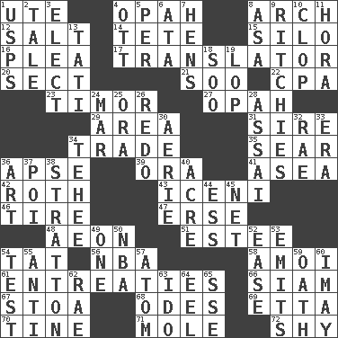 ACROSS 1. Shoshoni 4. Brightly colored fish 8. Bowlike part 12. Table seasoning 14. False hair 15. Grain storage tower 16. Entreaty 17. Interpreter 20. Religious group 21. "Barney Miller" actor Jack 22. Tax preparer (abbr.) 23. Southeast Indonesia island 27. Brightly colored fish 29. Type of rug 31. Beget 34. Exchange 35. Wither 36. Domed church section 39. Mouth or opening 41. Toward the sea 42. Writer of Portnoy's Complaint (1969) 43. Ancient Celtic tribe of eastern Britain 46. Hoop that covers a wheel 47. Celtic language 48. A really long time 51. First name in cosmetics 54. Make lace 56. Basketball assoc. 58. Mine, in Marseilles 61. Pleas 66. Thailand, formerly 67. Portico 68. Lyric poems 69. Singer James 70. Prong on a fork 71. Undercover agent 72. Like a shrinking violet DOWN 1. United States Postal Service (abbr.) 2. Story 3. Choose 4. Baseball player Mel 5. For each 6. "One Day ___ Time" 7. Coop moms 8. White ___ sheet 9. Actors Guy, Robert Welles, and Clint 10. Hoof sound 11. Israeli folk dance 13. Jacques of French films 18. "Barney Miller" actor Jack 19. Chop off 24. Spoil 25. Mouth or opening 26. Do over again 28. Slender Brazilian palm 30. Nest on high 32. Actress Charlotte 33. Epoch 34. Giggle 36. Tate display 37. Luau course 38. Ski resort town in Vermont 40. Measure of real estate 44. Double-curved letter 45. Fish or hair follower 49. Single 50. Basketball assoc. 52. Relaxation 53. Gives off 54. Trial 55. Against 57. Tiny particle 59. Pledge 60. "If ____ say so..." 62. Actress Charlotte 63. Wedding promise 64. Snakelike fish 65. Compass dir.