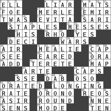 ACROSS 1. Pipe bend 4. One who doesn't tell the truth 8. Floor coverings 12. Enemy 13. Haggard of country music 14. Arab leader 15. It was, poetically 17. Webber/Rice musical 18. Indian skirt 19. Paper fasteners 21. Makes clutter 23. Part of HMS, perhaps 24. 17th letter of the Greek alphabet 26. Consenting reply 27. Tenth: prefix 28. Armed conflicts 30. Wind 31. Ear of corn 34. Head covering 37. Perceive with the eye 38. Having ears or earlike features 39. Mouth or opening 40. Increase 41. Cylindrical with tapered ends 42. Atlas unit 43. Johnson of "Laugh-In" 44. Balmoral and tarboosh 46. Compass dir. 47. Apply (a substance) by light strokes 50. Bear (Spanish) 51. Spoke pompously 54. Yearning 57. Assign a rank or rating to 58. U. of Maine site 60. Vintage cars 62. SW Saudi Arabia district 63. One shot 64. Compass dir. 65. Elected reps. 66. Method 67. "___ Little Indians" DOWN 1. Bank Draft (abbr.) 2. Moos 3. Resembling or made to resemble leather 4. Prying instrument 5. From or relating to Ireland 6. Keyboard modifier key 7. 480, 500 or 516 sheets of paper 8. Makes clutter 9. Collect or gather 10. Become fatigued 11. Indian titles of respect 13. Cartoonist voice _ Blanc 16. Ketch in the Levant 20. 23rd letter of the Greek alphabet 22. Jane of fiction 25. A small or young owl 27. Passed on 29. Assistant 30. White ___ sheet 31. Rendezvous 32. Having ears or earlike features 33. "We ___ not amused" (Victoria) 34. Piece 35. Ancient river in northeast Turkey 36. Infant food 41. Relationship diagram 43. Michaelmas daisies 44. Gear tooth 45. SW Saudi Arabia district 46. Smooth fabric 48. Verbally 49. Child's nurse 51. Mouths or openings 52. Raze (variant) 53. Dormintory (informal) 55. Lower and raise head in agreement 56. Went 59. Friend of Pooh 61. Elected rep.