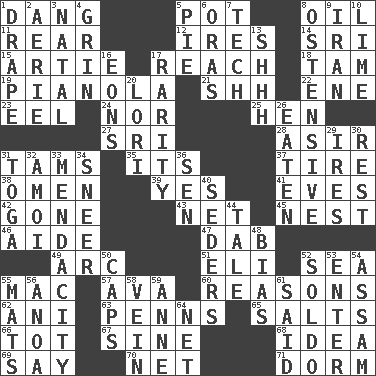 ACROSS 1. Mild oath, euphamism for damn 5. Cooking vessel 8. Petroleum 11. Tail end 12. Angers 14. _ Lanka 15. Nick name for Arthur 17. Arrive at 18. Scottish cap 19. Player piano 21. Quiet! 22. Compass dir. 23. Snakelike fish 24. Not either 25. Layer 27. Indian title of respect (Mr.) 28. SW Saudi Arabia district 31. Scottish caps 35. ___ a Wonderful Life 37. Hoop that covers a wheel 38. Presage 39. It is so 41. Nights before holidays 42. Went 43. Fish or hair follower 45. Egg locale 46. Assistant 47. Apply (a substance) by light strokes 49. Curve 51. Biblical high priest 52. Ocean 55. Apple computer (short form) 57. Actress Gardner 60. Thinks logically 62. Black tropical American cuckoo 63. Actor Sean's family 65. Table seasonings 66. Small child 67. Trig term 68. It may be bright or harebrained 69. Declare 70. Fish or hair follower 71. Dormintory (informal) DOWN 1. Window treatment 2. Nest on high 3. Relating to or accompanying birth 4. Amused look 5. Sliced dessert 6. Mouths or openings 7. Technical work 8. Clearly or manifestly demonstrative 9. SW Asia republic 10. Welles in "The Third Man" 13. Quiet! 16. Immeasurably long periods of time 17. Noteworthy scarcity 20. Australian parrot (variant) 26. Ingested 29. Angers 30. Remainder 31. Ancient Roman robe 32. Mine, in Marseilles 33. Ananias' fault 34. Scornful expression 36. Elected rep. 40. Spring feasts 44. Falsehood 48. Prejudice 50. Balmoral and tarboosh 52. Twentieth part of a lira 53. Keyboard key 54. Indian state 55. Floor protectors 56. Small Philippine buffalo 58. Distinctive style or manner 59. Singer Murray 61. Expressed in words 64. Fish or hair follower
