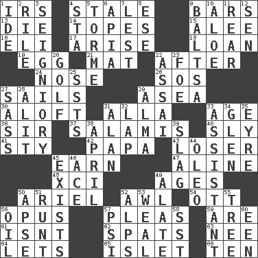 ACROSS 1. Big collection agency 4. Lacking originality or spontaneity 9. Oblong pieces of solid material 13. Pass on 14. Drinks excessively 15. Toward shelter 16. Biblical high priest 17. Originate 18. Grant temporary use of 19. Ovum 21. Floor covering 22. Following 24. Sense of smell 26. Distress signal 27. Travel by water 29. At sea 30. At or to great height 31. Silent film actress Nazimova 33. Grow older 36. Title for a knight 37. Deli grouping 40. Mischievous 41. Filthy place 42. Dad 43. Failure 45. Merit 47. Place in a line 48. One more than ninety 49. Ripens 50. Satellite of Uranus 52. Leather borer 54. Baseball player Mel 56. Musical composition 57. Entreaties 59. "We ___ not amused" (Victoria) 61. Is not 62. Arguments over trivial matters 63. Born 64. Allows 65. Small island 66. "___ Little Indians" DOWN 1. Binary compound 2. Cause heat under the collar 3. Signiory (variant) 4. R.R. building 5. Singer Mel 6. Capital of Western Samoa 7. For fear that 8. Compass dir. 9. Greek mezzo-soprano Agnes 10. _ vera 11. Located in or toward the back 12. Elected rep. 20. _ course 22. Slender Brazilian palm 23. Enemy 25. Fast planes 27. Backtalk 28. Came down and settled, as after flight 29. _ mater 31. ____ Jay Lerner 32. Pet locale 33. Helper 34. Small, secluded valley 35. Jane of fiction 38. Showery time 39. Volcanic refuse 44. Butter sub 45. Has an existence 46. Adept person 49. Having winglike extensions 50. Domed church section 51. The smallest animal of a litter 52. High mountains 53. Welt 55. Family _ (genealogy) 56. Petroleum 57. Air pressure measure (abbr.) 58. Fast jet (abbr.) 60. Car or cant ending