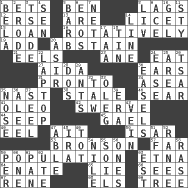 ACROSS 1. Stakes 5. Benjamin's nick name 8. Straggles 12. Celtic language 13. "We ___ not amused" (Victoria) 14. It is permitted: Lat. 15. Grant temporary use of 16. Rotating or pertaining to rotation 19. Find the sum of 20. Refrain by choice 21. Snakelike fish 23. A saturated hydrocarbon 24. Ingest 27. Opera by Verdi 30. Hearing organs 31. Right away 34. Toward the sea 35. Political cartoonist Thomas 38. Lacking originality or spontaneity 40. Singe 41. Butter sub 42. Turn aside suddenly 44. Ooze 45. Highlander 46. Snakelike fish 47. Small island 50. Astrian river, tributary to the Danube 53. "Death Wish" actor 57. Distant 59. Census information 63. Inactive volcano in Sicily 64. Maternal 65. Untruth 66. Perceives with the eye 67. French philosopher Descartes 68. Raised railways 69. Family _ (genealogy) DOWN 1. Actor Lugosi 2. Wear away 3. Sadhe (variant) 4. Elected rep. 5. Sharp remark 6. Greek god of love 7. Remaining after all deductions 8. 54 in ancient Rome 9. Adept person 10. Set 11. Filthy place 14. Actor's bit 17. American Automobile Association (abbr.) 18. Shallow baking pan 20. SW Saudi Arabia district 22. Portable computer 24. Relaxation 25. Length times width 26. Russian ruler of old 28. Two (Sp.) 29. Pismires 30. Artist's stands 32. The 23rd letter of the Hebrew alphabet 33. Cassini of fashion 35. Olfactory organ 36. Toward shelter 37. Stitch closed the eyes of (a falcon) 39. Period 43. Distinctive style or manner 47. Competent 48. Retirement account (abbr.) 49. Small child 51. Following 52. Indian princess (variant) 54. "Death on the ____" 55. The visible part of the earth's surface 56. Washington bills 58. Raze (variant) 59. For each 60. Single 61. Baking dish 62. Shoshoni 63. Eastern Standard Time (abbr.)