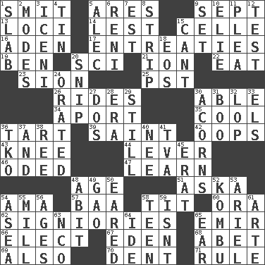 ACROSS 1. Stricken, poetically 5. Ancient Greek god of war 9. Back-to-school mo. 13. Event scenes 14. For fear that 15. Cell (Danish) 16. Arabian gulf 17. Pleas 19. Benjamin's nick name 20. _-fi 21. Electrically charged atom 22. Consume 23. The Jewish people; Israel 25. Pacific Standard Time (abbr.) 26. Amusement-park features 30. Competent 34. To the left, to Queeg 35. Calm and collected 36. Small pie 39. Virtuous person 42. I made a mistake 43. Leg joint 44. Prying instrument 46. Wrote a lyric poem 47. Acquire or gain knowledge or skills 48. Grow older 51. "____ silly question..." 54. Nursemaid (var.) 57. Sound made by sheep 58. Teat (slang) 60. Mouth or opening 62. Seigniories (variant) 65. Arab leader 66. Opt 67. Locale of original sin 68. Collude with 69. In addition 70. Incision 71. Governing power DOWN 1. Broad, flat, thick piece 2. Methods 3. Ancient Celtic tribe of eastern Britain 4. Metal container 5. Actor Baldwin 6. Painter Guido (1575-1642) 7. Eastern Standard Time (abbr.) 8. Empty completely 9. Put into a specified state 10. Writer Wiesel 11. Entreaty 12. Trial 15. Patter 18. Greek goddess of the dawn 20. Clip 24. Declaimed 27. Two (Sp.) 28. Period 29. Not moving 30. Oak nuts 31. Surprise greeting 32. Chop off 33. Raised railways 36. Ring climax 37. Plus 38. Portuguese money of account (variant) 40. Born 41. Federal power corp. 45. Part of Q.E.F. 48. "This won't hurt ____!" 49. E Mali city 50. Having ears or earlike features 52. Dried seaweed eaten as food 53. Satellite of Uranus 54. Toward the sea 55. Place where flour is made 56. Grows older 58. Adolescent 59. Is not 61. Johnson of "Laugh-In" 63. Non-commissioned officer (abbr.) 64. Binary compound 65. Ewer handle