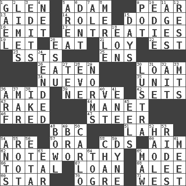 ACROSS 1. Small, secluded valley 5. First of billions? 9. Lightbulb-shaped fruit 13. Assistant 14. Hero or heavy, e.g. 15. Evade 16. Send forth 17. Pleas 19. Allow 20. Ingest 21. Myrna of the movies 22. Eastern Standard Time (abbr.) 23. Fast planes 25. Followers of ems 26. Eroded 30. Rich soil 34. New (sp.) 35. A single undivided whole 36. Among 39. Impudent aggressiveness 42. Arranges properly for use 43. Libertine 44. French painter Edouard 46. Flintstone 47. Guide 48. English channel? 51. Cowardly lion portrayer 54. "We ___ not amused" (Victoria) 57. Mouth or opening 58. Music discs 60. Direct toward a target or goal 62. Music shop? 65. Method 66. "_____ Recall" 67. Grant temporary use of 68. Toward shelter 69. Play the lead 70. Legendary monster 71. Compass direction DOWN 1. Highlander 2. Citrus fruits 3. Prepares for publication 4. Fish or hair follower 5. Length times width 6. Do not 7. Keyboard modifier key 8. Haggard of country music 9. Plant holder 10. Singer Brickell 11. Grows older 12. Repose 15. 24-hour periods 18. Age 20. Son of Isaac 24. Watched over 27. Nine, plus one 28. First lady 29. Typical standards 30. A period of five years 31. Single 32. Small island 33. Mountains (abbr.) 36. Sandy's bark 37. Make imperfect 38. Mamie's mate 40. Large container 41. Compass dir. 45. Snakelike fish 48. Soup holder 49. Sis' sibling 50. Monte _, Las Vegas Hotel/Casino 52. White Person, in Hawaii 53. Amusement-park features 54. Pismires 55. Carrot, for example 56. Singer James 58. Burn to charcoal 59. Unit of force 61. Rendezvous 63. Hearing organ 64. Coat; cloak 65. Informal term for the mouth