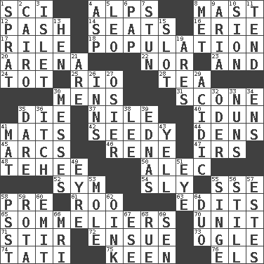 ACROSS 1. _-fi 4. High mountains 8. Vertical spar for supporting sails 12. Romantic infatuation 14. Theater features 16. 4th largest of the Great Lakes 17. Cause heat under the collar 18. Census information 20. Sports stadium 22. Not either 23. Added to 24. Small child 25. _ de Janeiro 28. Beverage made from leaves 30. Not women's 31. Biscuitlike quick bread 35. Expire 37. The longest river in the world 40. Goddess of spring and wife of Bragi 41. Floor protectors 42. Sleazy 44. Cub Scout units 45. Arches 46. French philosopher Descartes 47. Big collection agency 48. Giggle 50. Actor Baldwin 52. Symbol (abbr.) 54. Roguish 55. Compass dir. 58. Before (prefix) 61. Friend of Pooh 63. Prepares for publication 65. Wine waiters 70. A single undivided whole 71. Tumult 72. Take place subsequently 73. Stare at amorously 74. Jacques of French films 75. Peachy ____! 76. Raised railways DOWN 1. Small fatty European fish 2. Capital of Egypt 3. Small island 4. Cleo's killer 5. Lion 6. Infant food 7. Make senseless or dizzy 8. Was introduced to 9. Operatic vocal solo 10. The Jewish people; Israel 11. Watch over 13. Layer 15. Groove 19. Ancient Greek god of war 21. "We ___ not amused" (Victoria) 26. Lodging establishments 27. Flexible twig of a willow tree 29. Being or containing an acid 30. Makes clutter 32. River in Europe 33. Religious women 34. Followers of ems 35. Have the gumption 36. Hankering 38. Area sheltered from the wind 39. Ferber et al. 41. Floor protector 43. Shout 49. Jane of fiction 51. Sight organ 53. Undercover agent 55. Scorch 56. Free from disturbance or agitation 57. _____ Park, CO 58. Inconspicuous attention getter 59. Roll call or roster of names 60. Send forth 62. Pig sound 64. Superhero pair 66. Medical imaging device (abbr.) 67. Compass dir. 68. Regret 69. Elected rep.