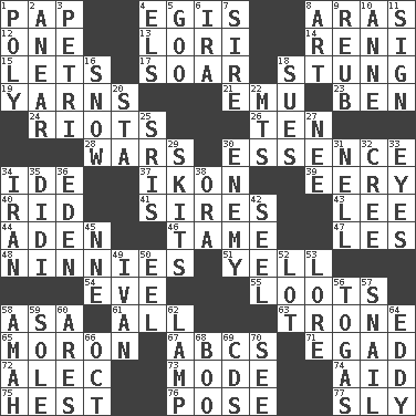 ACROSS 1. Infant food 4. The front part of a cuirass 8. Ancient river in northeast Turkey 12. Single 13. Australian parrot (variant) 14. Painter Guido (1575-1642) 15. Allows 17. Fly high 18. Feeling sharp psychological pain 19. Tall tales 21. Australian flightless bird 23. Benjamin's nick name 24. Disturbances 26. Nine, plus one 28. Armed conflicts 30. Gist 34. Binary compound 37. Picture 39. Suggestive of the supernatural 40. To free from 41. Fathers 43. Area sheltered from the wind 44. Arabian gulf 46. Docile 47. French article 48. Simpletons 51. Shout 54. Night before a holiday 55. Plunders 58. White ___ sheet 61. 100% 63. Marketplace scale 65. Person of subnormal intelligence 67. Lettered men learn these first 71. Mild oath 72. Actor Baldwin 73. Method 74. Help 75. Behest 76. Airs 77. Wily DOWN 1. Many (prefix) 2. Approach 3. _ dish (used to culture cells) 4. Raised railways 5. Thick or sticky substance 6. Lyricist Gershwin 7. The founder of a family 8. Tate display 9. Reuben's nickname 10. Singer Murray 11. Public display of a written message 16. Overwhelm 18. Institutes legal proceedings 20. R.R. building 22. Mountains (abbr.) 25. Indian titles of respect 27. Born 29. Burlesque acts 30. Foe 31. 1994 drama film starring Jodie Foster 32. Algonquian 33. Snake ____ (dice throw) 34. SW Asia republic 35. "You Light Up My Life" star Conn 36. Locale of original sin 38. Mouth or opening 42. Stitch closed the eyes of (a falcon) 45. Compass dir. 49. "Terrible" tsar 50. Snakelike fish 52. Car dealer's back yard 53. Old wives' tales, e.g. 56. Ancient Roman robes 57. Slow-paced one 58. Nursemaid 59. Flatfish 60. Ancient Greek god of war 62. Desk light 64. Whirlpool 66. Sep. follower 68. Oct. 31 cry 69. Music discs 70. Perceive with the eye