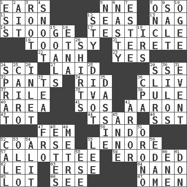 ACROSS 1. Hearing organs 5. Compass dir. 8. Bear (Spanish) 11. The Jewish people; Israel 12. Oceans 13. Tired old horse 14. Moe Howard, for one 17. One of the two male reproductive glands 19. Tootsie (variant) 21. Cylindrical with tapered ends 22. Hyperbolic tangent 23. Affirmative reply 24. _-fi 27. Put down 29. Compass dir. 32. Leg coverings 34. To free from 36. 154 in Roman numerals 37. Cause heat under the collar 38. Federal power corp. 39. Whine 40. Length times width 41. Mayday 42. Composer Copland 43. Small child 44. Russian ruler of old 46. Fast jet (abbr.) 47. Opposite of masc. 50. Southeast Asian peninsula 52. Unrefined 55. Poe poem 57. One to whom something is allotted 59. Eaten away 62. Flowery wreath 63. Celtic language 64. Billionth: prefix 65. Car dealer's back yard 66. Observe 67. Sign of something about to happen DOWN 1. Curvy letter 2. Small island 3. Carrot, for example 4. Snout, nose 5. Born 6. Difficult 7. First name in cosmetics 8. Single time 9. Table seasoning 10. Double curve, resembling the letter S 12. Filthy place 15. Purposes of endeavors 16. Inactive volcano in Sicily 18. Big collection agency 20. Chest coverings 24. Small fatty European fish 25. Capital of Egypt 26. An arm off of a larger body of water 28. A piece of turf (Scot.) 29. Disparaging remarks 30. Grain storage towers 31. Incident 33. Beverage made from leaves 35. Hyrax 36. Tax preparer (abbr.) 42. Zeal 45. Singer Murray 47. From 48. _____ Park, CO 49. Distance measurement (Brit.) 51. U. of Maine site 52. Give a ring to 53. Margarine 54. Came down and settled, as after flight 55. Area sheltered from the wind 56. Dutch treat 58. Compass dir. 60. Compass dir. 61. Spanish title