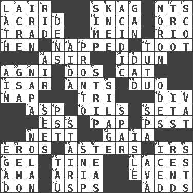 ACROSS 1. Den 5. Heroin 9. Mountains (abbr.) 12. Bitter 14. South American Indian 15. The grampus (Milton) 16. Buy and sell 17. Count _ (2 wds.) 18. _ de Janeiro 19. Layer 20. Slept 23. A blast of a horn 24. SW Saudi Arabia district 25. Goddess of spring and wife of Bragi 27. Hindu god of fire 30. Two (Sp.) 32. Feline 33. Austrian river, tributary to the Danube 34. Pismires 36. Superhero pair 38. Atlas unit 39. Three (prefix) 40. HTML Container Element 43. Viper 46. Petroleums 48. Stalk of a moss capsule 49. Curvy letter 51. Infant food 52. Inconspicuous attention getter 53. Remaining after all deductions 54. Greek goddess of the earth (variant) 56. Greek god of love 58. Michaelmas daisies 61. Big collection agency 64. Set 65. Prong on a fork 66. Shoestrings 68. Nursemaid (var.) 69. Operatic vocal solo 70. Incident 71. Spanish title 72. United States Postal Service (abbr.) 73. Sums up DOWN 1. Thin strip of wood or metal 2. 1/640 square mile 3. SW Asia republic 4. To free from 5. Simple or foolish person 6. Leg joint 7. Being or containing an acid 8. Separate the seeds from cotton 9. Person of subnormal intelligence 10. Musical group of three 11. Native of Scotland 13. Hiding places for outlaws 21. Opera by Verdi 22. Right away 23. Ballerina skirt 24. Wind 26. June honoree 27. Direct toward a target or goal 28. Girls' org. (abbr.) 29. California wine valley 31. Long narrow piece of something 35. Fodder prepared in a silo 37. Lyric poems 41. It is 42. Large container 44. Perceives with the eye 45. Pacific Standard Time (abbr.) 47. Practice fight 48. Health resort 50. Flight of steps 53. Pitcher Ryan 55. Small island 56. Mild oath 57. San ____ (Riviera town) 59. Sever or remove by pinching or nipping 60. Beverages made from leaves 61. On the rocks 62. Tear apart 63. Fast planes 65. The 19th letter of the Greek alphabet 67. Actress Gardner