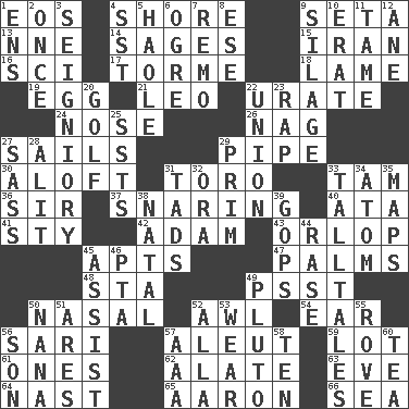 ACROSS 1. Greek goddess of the dawn 4. Dinah or Pauly 9. Stalk of a moss capsule 13. Compass dir. 14. Gurus 15. SW Asia republic 16. _-fi 17. Singer Mel 18. Unable to walk 19. Oval reproductive body of a fowl 21. Lion 22. A salt of uric acid 24. Olfactory organ 26. Tired old horse 27. Travel by water 29. Corncob 30. At or to great height 31. "Corrida" creature 33. Scottish cap 36. Title for a knight 37. Catching in a trap 40. _ moment's notice (2 wds.) 41. Filthy place 42. First man 43. Lowest deck of a ship 45. Flats, for short 47. Insides of hands 48. R.R. building 49. Inconspicuous attention getter 50. Rhinal 52. Leather borer 54. Hearing organ 56. Indian skirt 57. Native American of Southwest Alaska 59. Car dealer's back yard 61. Singles 62. Having winglike extensions 63. First lady 64. Political cartoonist Thomas 65. Composer Copland 66. Ocean DOWN 1. Followers of ems 2. Single time 3. Signiory (variant) 4. Fast jet (abbr.) 5. White Person, in Hawaii 6. Legendary monster 7. San ____ (Riviera town) 8. Compass dir. 9. Fodder prepared in a silo 10. Part of Q.E.F. 11. Docile 12. A saturated hydrocarbon 20. Eighteen holes 22. The state of being joined or united 23. Strike 25. Fast planes 27. Backtalk 28. Came down and settled, as after flight 29. Demure 31. Bits 32. Mouth or opening 33. Baron Munchausen's specialties 34. Tiny particle 35. Atlas contents 38. Relating to or accompanying birth 39. Republicans 44. Raze (variant) 45. Help 46. Parent Teacher Association (abbr.) 49. Cartoon dog 50. Grandmother 51. Ancient Greek god of war 52. Silent film actress Nazimova 53. Erode 55. Be footloose 56. Boy, to dad 57. American Automobile Association (abbr.) 58. Nine, plus one 60. Beverage made from leaves