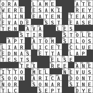 ACROSS 1. Mouth or opening 4. Unable to walk 8. Had dinner 11. Past tense of be (plural) 13. 1973 Nobel Price Winner (Physics) Leo 15. Marina Del _, California 16. (Had) reclined 17. Consumed 18. Pull into pieces 19. Dodge 21. Fast jet (abbr.) 22. Comfort 23. "___ Little Indians" 24. Actress Gardner 27. French article 29. Use a swizzle stick 30. Took without asking 34. Fitting 36. Smallest unit of an element 39. Grain storage towers 40. One who doesn't tell the truth 41. It is permitted: Lat. 43. A slight indication 44. Ferber et al. 46. Singer James 47. Infant locale 48. Trials 49. Otherwise 51. John Ritter's dad 53. To riddle 54. A saturated hydrocarbon 57. "Tell ____ the Marines!" 60. Cartoonist voice _ Blanc 63. Mole, birthmark 65. Within a short period 66. N. Chile seaport 69. Do not 70. Not either 71. Echolocation 72. Trig term 73. Affectionate concern, for short 74. Back-to-school mo. 75. Color DOWN 1. A small or young owl 2. Break or tear apart 3. Believer in; advocate of (suffix) 4. Area sheltered from the wind 5. White ___ sheet 6. Floor protectors 7. Supplements with great effort 8. Length times width 9. Beverages made from leaves 10. Jane of fiction 12. Conclude 14. International (abbr.) 18. A testis 20. Consume 25. Small bottle 26. Nick name for Arthur 28. Curvy letter 29. Ski resort town in Vermont 31. Spanish pot 32. Central Nebraska county 33. Compass dir. 34. Assistant 35. Zero-star reviews 37. Sep. follower 38. Distance measurement 40. Allow 42. Story 45. Compass dir. 50. Elected rep. 52. Dec. holiday 54. Shun 55. Pet term 56. First name in cosmetics 57. Is not 58. Instrument 59. Torque (variant) 61. Greek god of love 62. Actor's bit 64. Begley and Asner 67. Head covering 68. Nonscientific branch of learning