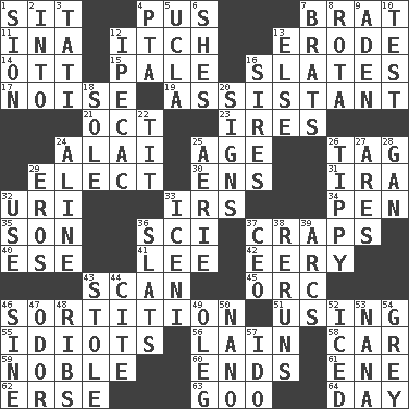 ACROSS 1. Be seated 4. Festering 7. Naughty child 11. _ tizzy (2 wds.) 12. Hankering 13. Wear away 14. Baseball player Mel 15. Diluted with white 16. Chalkboards 17. Annoying sound 19. Helper 21. Sep. follower 23. Angers 24. Jai _ 25. Mature 26. Label 29. Voters do this 30. Followers of ems 31. Lyricist Gershwin 32. RI univ. 33. Big collection agency 34. Animal enclosure 35. Male child 36. _-fi 37. Dice game 40. Compass dir. 41. Area sheltered from the wind 42. Suggestive of the supernatural 43. Examine minutely or intensely 45. The grampus (Milton) 46. Conclusion 51. Exploiting 55. Foolish or stupid persons 56. (Had) reclined 58. 4-wheeled motor vehicle 59. Impressive in appearance 60. Conclusions 61. Compass dir. 62. Celtic language 63. Thick or sticky substance 64. 24 hours DOWN 1. The Jewish people; Israel 2. To the inside or interior of 3. Jacques of French films 4. Parent Teacher Association (abbr.) 5. Southern CA. univ. 6. "______ My Girl" (Turtles hit) 7. Naughty children 8. Roll call or roster of names 9. Arabian gulf 10. Trial 12. Medicinal drug used to evoke vomiting 13. Otherwise 16. Male parents of animals 18. Flatfish 20. Signals 22. Teat (slang) 24. Place in a line 25. Nest on high 26. Likely to tip or tilt 27. Ancient Greek god of war 28. Separate the seeds from cotton 29. Greek god of love 32. Purpose 33. Ancient Celtic tribe of eastern Britain 36. Narrow boards 37. Corporate head (abbr.) 38. Summer TV shows 39. Arches 43. Took without asking 44. Quote 46. Trig term 47. Scent 48. Chest bones 49. Cassini of fashion 50. Billionth: prefix 52. On the rocks 53. Grandmother 54. Jennifer or Joel 57. Wedding promise