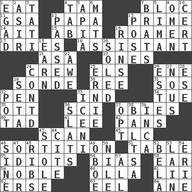 ACROSS 1. Erode 4. Scottish cap 7. Coalition 11. Girls' org. (abbr.) 12. Dad 13. First class 14. Small island 15. "This won't hurt ____!" 16. Wanderer 17. Frees from moisture 19. Aide 21. White ___ sheet 23. Singles 24. Ship's personnel 25. Raised railways 26. Compass dir. 29. Message 30. Portuguese money of account (variant) 31. Mayday 32. Animal enclosure 33. Indiana (abbr.) 34. Third day of the wk. 35. Baseball player Mel 36. _-fi 37. Off-Broadway awards 40. Small boy 41. Area sheltered from the wind 42. Baking dishes 43. Skim 45. Affectionate concern, for short 46. Determination 51. Eating place 55. Foolish or stupid persons 56. Prejudice 58. Hearing organ 59. Having high moral qualities 60. Water jar 61. Cards in a Roman deck? 62. Celtic language 63. Snakelike fish 64. One (Scot) DOWN 1. Mild oath 2. SW Saudi Arabia district 3. Jacques of French films 4. Keyboard key 5. Capital of Western Samoa 6. Floor protectors 7. Naughty children 8. Pale green bean 9. Sign of something about to happen 10. Sure thing 12. Went by 13. Airs 16. Remove soap 18. Merit 20. Having a sole or soles 22. Deep reverence 24. Continued (abbr.) 25. Bert's buddy 26. _____ Park, CO 27. Horse sense 28. Compass dir. 29. Bristle 32. Cooking vessel 33. Ancient Celtic tribe of eastern Britain 36. Narrow boards 37. Choose 38. Greek mezzo-soprano Agnes 39. South American Indian 43. Took without asking 44. Quote 46. Trig term 47. Aroma 48. Chest bones 49. Mitch Miller's instrument 50. The longest river in the world 52. Actor Lugosi 53. (Had) reclined 54. One of the Great Lakes 57. Everything