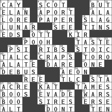 ACROSS 1. Island 4. Highlander 8. Yet 11. Style 13. To the left, to Queeg 15. Insect wing 16. Old wives' tales, e.g. 17. Some stationery 18. Volcanic refuse 19. Type of eclipse 21. Perceive with the eye 22. Canisters 23. Begley and Asner 24. Baseball player Mel 27. Apertif with cassis 29. "Silly old bear" 30. Clothes sense 34. 23rd letter of the Greek alphabet 36. Teases 39. Unemotional 40. Baby powder 41. Dice game 43. "Corrida" creature 44. Having winglike extensions 46. Have the gumption 47. Single 48. To get out of a bus 49. Period of immesurable duration 51. Portuguese money of account (variant) 53. Affectionate concern, for short 54. R.R. building 57. 1/640 square mile 60. Krazy ___ of comics 63. Makes less strong or intense 65. Scornful sounds 66. Dodge 69. Armed conflicts 70. Oct. 31 cry 71. Fathers 72. Celtic language 73. Keyboard modifier key 74. Do not 75. "___ Little Indians" DOWN 1. Cell (Danish) 2. Verbally 3. Tall tales 4. Plant excrement 5. Accounting whiz (abbr.) 6. I made a mistake 7. Family _ (genealogy) 8. Indonesian resort city 9. ____ Bator, Mongolia 10. Labels 12. Teachers' org. 14. Long journey 18. Ski resort town in Vermont 20. Friend of Pooh 25. Torque (variant) 26. One of three equal parts 28. ___ a Wonderful Life 29. Photos 31. Within a short period 32. Become fatigued 33. Environmental prefix 34. Diluted with white 35. Broad, flat, thick piece 37. Sound made by sheep 38. Small fatty European fish 40. Bit 42. Sew up the eyelids of hawks and falcons 45. Compass dir. 50. Sep. follower 52. Supplements with great effort 54. Don Adams' spy role 55. Laconic 56. NE Netherlands city 57. Swedish rock group 58. Calm and collected 59. Carrot, for example 61. Enthusiastic 62. Edible starchy tuberous root 64. Deep reverence 67. Lair 68. Eastern Standard Time (abbr.)