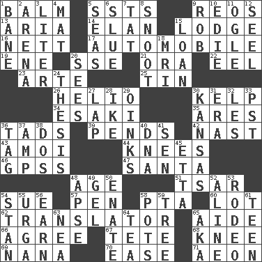 ACROSS 1. Lip ointment 5. Fast planes 9. Vintage cars 13. Operatic vocal solo 14. Liveliness 15. Cabin 16. Remaining after all deductions 17. Form of transportation 19. Compass dir. 20. Compass dir. 21. Mouth or opening 22. Snakelike fish 23. Johnson of "Laugh-In" 25. Metal container 26. Sun: prefix 30. Seaweed 34. 1973 Nobel Price Winner (Physics) Leo 35. Ancient Greek god of war 36. Small amounts or degrees 39. Depends 42. Political cartoonist Thomas 43. Mine, in Marseilles 44. Leg joints 46. Global Positioning Systems (abbr.) 47. Before Barbara or Clara 48. Mature 51. Russian ruler of old 54. Take to court 57. Fenced enclosure 58. Parent Teacher Assoc. 60. Car dealer's back yard 62. Interpreter 65. Assistant 66. Match 67. Wig 68. Leg joint 69. Nanny 70. Comfort 71. A really long time DOWN 1. Object of repulsion 2. Sports stadium 3. 61 cubic inches 4. Floor protector 5. Oceans 6. Turn sharply 7. Make lace 8. Snout, nose 9. Director Reiner 10. Singer Brickell 11. Stare 12. Sew up the eyelids of hawks and falcons 15. Grant temporary use of 18. Medical imaging device (abbr.) 20. Perceives with the eye 24. College paper 27. Infant locale 28. Mamie's mate 29. Pig sounds 30. Sunflower state 31. Period 32. French article 33. Pacific Standard Time (abbr.) 36. Label 37. Electrical Unit 38. Two (Sp.) 40. Heredity factor (abbr.) 41. Elected rep. 45. Singer James 48. Domed church section 49. Set 50. Maternal 52. Place in a line 53. Cowboy competition 54. Comedian Laurel of Laurel & Hardy 55. Capital and largest city of Mongolia 56. Merit 58. Plant holders 59. Family _ (genealogy) 61. Adolescent 63. Teachers' org. 64. Afternoon social gathering 65. Alias (abbr.)