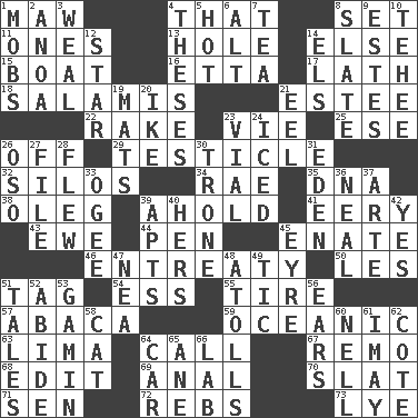 ACROSS 1. Informal term for the mouth 4. Not this but _ 8. Put into a specified state 11. Washington bills 13. Hollow 14. Otherwise 15. Water vessel 16. Singer James 17. Thin strip of wood or metal 18. Deli grouping 21. First name in cosmetics 22. Immoral or dissolute person 23. Compete 25. Compass dir. 26. Below a satisfactory level 29. A testis 32. Grain storage towers 34. Actress Charlotte 35. Heredity factor (abbr.) 38. Cassini of fashion 39. Hold, grip (Informal) 41. Suggestive of the supernatural 43. She-sheep 44. Writing instrument 45. Maternal 46. Plea 50. French article 51. Label 54. Curvy letter 55. Hoop that covers a wheel 57. Phillipine bananalike plant 59. Pertaining to the sea 63. Pale green bean 64. Give a ring to 67. San ____ (Riviera town) 68. Prepare for publication 69. Of or related to the anus 70. Narrow board 71. Elected rep. 72. Confederate soldiers (slang) 73. Sodium hydroxide DOWN 1. Disorderly crowds 2. Small Philippine buffalo 3. Welt 4. College papers 5. Being at a high temperature 6. Keyboard modifier key 7. Afternoon social gathering 8. Schedule 9. _____ Park, CO 10. Giggle 12. Play the lead 14. Raised railways 19. Floor coverings 20. Mamie's husband 21. Snakelike fish 23. Small bottle 24. On the rocks 26. Bear (Spanish) 27. Do some clerical work 28. Soared 30. Marketplace scale 31. Paradise 33. Double curve, resembling the letter S 36. Actress Patricia 37. Johnson of "Laugh-In" 39. Flats, for short 40. Possessive pronoun 42. Affirmative reply 45. Jane of fiction 47. Teachers' org. 48. Ringlike coral islands and reefs 49. Nervous spasm 51. Stories 52. Tolerate 53. Homeless child 56. Hearing organs 58. Domesticated feline 60. 1994 drama film starring Jodie Foster 61. "If ____ say so..." 62. ____ d'Azur (French Riviera) 64. Automobile 65. One (Scot) 66. Experiment locale