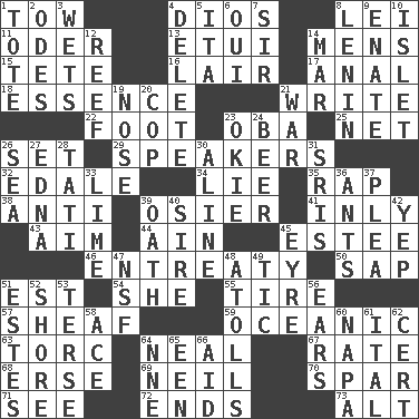 ACROSS 1. Pull behind 4. "Vaya con ____" 8. Luau accessory 11. River in Europe 13. Needle case 14. Not women's 15. False hair 16. Den 17. Of or related to the anus 18. Core 21. Compose 22. 12 inches 23. Chief or king in Benin or Nigeria 25. Fish or hair follower 26. Arrange properly for use 29. Orators 32. Peak District village in England 34. Untruth 35. Strike 38. Opposed to 39. Flexible twig of a willow tree 41. Inwardly 43. Direct toward a target or goal 44. The 18th letter of the Arabic alphabet 45. First name in cosmetics 46. Plea 50. Plant excrement 51. Eastern Standard Time (abbr.) 54. A female animal or person 55. Become fatigued 57. To gather and bind into a bundle 59. Pertaining to the sea 63. Torque (variant) 64. Actress Patricia 67. Assign a rank or rating to 68. Celtic language 69. Famous astronaut Armstrong 70. Practice fight 71. Perceive with the eye 72. Extremities 73. The first octave above the treble staff DOWN 1. Carry 2. Lyric poems 3. Moistens 4. Erase 5. Call ___ day 6. Fr. "Yes" 7. Title for a knight 8. Soviet premier 1918-24 9. Maternal 10. Small island 12. Coral collection 14. Make imperfect 19. Olfactory organ 20. Police officer (slang) 21. Armed conflict 23. Migrant worker of the '30s 24. Fermented drink made from hops 26. Ocean 27. Pulitzer Prize-winning author Ferber 28. Jacques of French films 30. Place in a line 31. Indian titles of respect 33. Welles in "The Third Man" 36. Pismires 37. Entreaty 39. Pledge 40. Title for a man of rank and authority 42. Slangy assent 45. Jane of fiction 47. Science/research agcy. 48. Ringlike coral islands and reefs 49. Nervous spasm 51. _____ Park, CO 52. Dinah or Pauly 53. Laconic 56. Hearing organs 58. Adept person 60. California wine valley 61. Slanted text style (abbr.) 62. Sure thing 64. Compass dir. 65. Car or cant ending 66. Help