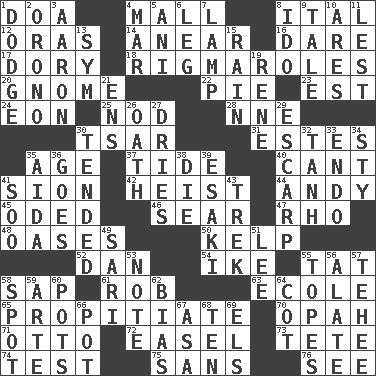 ACROSS 1. ___ good deed 4. Shopping center 8. Slanted text style (abbr.) 12. Mouths or openings 14. Approach 16. Have the gumption 17. Dinghy 18. Frustrating wastes of time 20. Dwarf 22. Sliced dessert 23. Eastern Standard Time (abbr.) 24. Age 25. Lower and raise head in agreement 28. Compass dir. 30. Russian ruler of old 31. _____ Park, CO 35. Personal question 37. Periodic rise and fall of the sea level 40. Patter 41. The Jewish people; Israel 42. Robbery 44. Actor Griffith 45. Wrote a lyric poem 46. Shrivel 47. 17th letter of the Greek alphabet 48. Fertile tracts in a desert 50. Seaweed 52. One of the 12 tribes of Israel 54. Mamie's mate 55. Make lace 58. Plant excrement 61. Director Reiner 63. Learning spot: Fr. 65. Appease 70. Brightly colored fish 71. "Beetle Bailey" pooch 72. Artist's stand 73. Wig 74. Trial 75. Without 76. Observe DOWN 1. Evade 2. U. of Maine site 3. Composer Copland 4. Third mo. 5. Cuckoo 6. Part of a journey 7. Desk light 8. Wedding promise 9. Story 10. Ancient Greek god of war 11. For fear that 13. Symbol (abbr.) 15. Precipitation 19. French philosopher Descartes 21. Followers of ems 26. Pledge 27. Frees from moisture 29. Fortification 30. Watched over 32. Hyperbolic tangent 33. Inside; within (prefix) 34. Filthy place 35. Opera by Verdi 36. Leaves 38. Pass on 39. 1973 Nobel Price Winner (Physics) Leo 41. "Barney Miller" actor Jack 43. Long journey 49. Indian skirt 51. Area sheltered from the wind 53. Make mention of 55. Drinks excessively 56. Having winglike extensions 57. Giggle 58. Blemish 59. Johnson of "Laugh-In" 60. Cooking vessels 62. Prejudice 64. Small bed 66. Cooking vessel 67. White ___ sheet 68. Nine, plus one 69. Raised railways