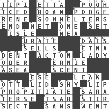 ACROSS 1. Native american tent (variation) 5. Singer James 9. "Silly old bear" 13. On the rocks 14. Wander 15. Puddle 16. French philosopher Descartes 17. Wine waiters 19. Conclusion 20. Soggy 21. Single 22. Arrange properly for use 23. Small island 25. Teachers' org. 26. A salt of uric acid 30. Raised platform 34. Makes a sale 35. Inactive volcano in Sicily 36. Scratch 39. Gambison 42. Kenny Rogers chart-topper in '80 43. Baltic tributary 44. Bert's buddy 46. Toward the sea 47. Aroma 48. Compass dir. 51. Path through which fluid escapes 54. Baseball player Mel 57. Flaplike covering 58. Like a shrinking violet 60. Mouth edge 62. Appease 65. "Two Mules for Sister ____" 66. Laconic 67. Russian ruler of old 68. Use a swizzle stick 69. Religious group 70. Without 71. Gone DOWN 1. Become fatigued 2. Ancient Celtic tribe of eastern Britain 3. Depends 4. Binary compound 5. Celtic language 6. A blast of a horn 7. Scottish cap 8. ID or VA city 9. Luau course 10. Lyric poems 11. Legendary monster 12. Behest 15. Entreaty 18. Compass dir. 20. Past tense of be (plural) 24. A period of five years 27. In the manner of 28. Affectionate concern, for short 29. _____ Park, CO 30. Keyboard key 31. "One Day ___ Time" 32. Working for oneself (abbr.) 33. Declare 36. ___ good deed 37. Begley and Asner 38. Born 40. The grampus (Milton) 41. Compass dir. 45. In an inward manner 48. Writer Wiesel 49. Be seated 50. Prepares for publication 52. Having winglike extensions 53. Japanese brewing company 54. Elects 55. Relationship diagram 56. Torque (variant) 58. Comedian Laurel of Laurel & Hardy 59. Possessive pronoun 61. Piece 63. Pacific Standard Time (abbr.) 64. White ___ sheet 65. Compass dir.