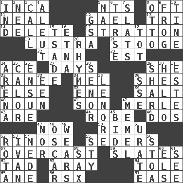 ACROSS 1. South American Indian 5. Mountains (abbr.) 8. Often (poetically) 11. Be tempered by heat 12. Highlander 13. Three (prefix) 14. Erase 17. Ski resort town in Vermont 19. A period of five years 21. Moe Howard, for one 22. Hyperbolic tangent 23. Eastern Standard Time (abbr.) 24. Adept person 27. 24-hour periods 29. A female animal or person 32. The wife of a rajah (variant) 34. Cartoonist voice _ Blanc 36. "______ My Girl" (Turtles hit) 37. Otherwise 38. Compass dir. 39. Table seasoning 40. Part of speech 41. Male child 42. Haggard of country music 43. "We ___ not amused" (Victoria) 44. Loose flowing garment 46. Two (Sp.) 47. Immediately 50. Tall New Zealand timber tree 52. Full of chinks, cracks, or crevices 55. Spring feasts 57. Cloudy 59. Chalkboards 62. Bit 63. Like ___ of sunshine 64. Lacquered or enameled metalware 65. A saturated hydrocarbon 66. Acura sports coupe 67. Relaxation DOWN 1. Indiana (abbr.) 2. Born 3. Give a ring to 4. Eskimo relative 5. Floor protector 6. Laconic 7. Narrow boards 8. Von Bismarck 9. Toadlike animal 10. Prong on a fork 12. Girls' org. (abbr.) 15. Sadhe (variant) 16. Inactive volcano in Sicily 18. Small child 20. Poems 24. Sports stadium 25. Bodily heat indicating an inflammation 26. Follow as a consequence or result 28. Sir (Sp.) 29. Pottery fragment 30. Phone greeting 31. _____ Park, CO 33. Car or cant ending 35. Poe poem 36. Compass dir. 42. Klaipeda city 45. Auction offers 47. Not either 48. Witty Wilde 49. Puts on (as clothing) 51. A salt of uric acid 52. Roll call or roster of names 53. _ the terrible 54. Ancient Persian 55. Filthy place 56. Portico 58. Saxophone 60. Raised railways 61. Observe