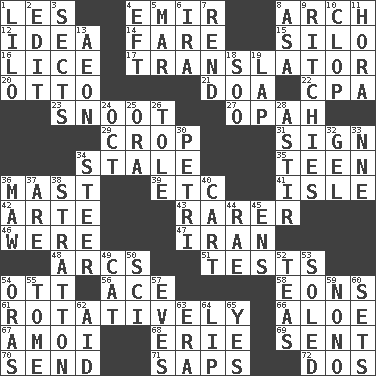 ACROSS 1. French article 4. Independent ruler or chieftain 8. Bowlike part 12. The main thing one is thinking about 14. Conductor's collection 15. Grain storage tower 16. Louse (plural) 17. Interpreter 20. Von Bismarck 21. ___ good deed 22. Accounting whiz (abbr.) 23. Snout, nose 27. Brightly colored fish 29. Riding implement 31. Attach a signature 34. Having lost freshness 35. Adolescent 36. Vertical spar for supporting sails 39. And so on (abbr.) 41. Capri or Wright 42. Johnson of "Laugh-In" 43. More valued for its uncommonness 46. Past tense of be (plural) 47. SW Asia republic 48. Curves 51. Trials 54. Baseball player Mel 56. Adept person 58. Immeasurably long periods of time 61. Rotating or pertaining to rotation 66. _ vera 67. Mine, in Marseilles 68. One of the Great Lakes 69. Posted 70. Post 71. Plant excrements 72. Two (Sp.) DOWN 1. _ and Stitch 2. Prepare for publication 3. Religious groups 4. Bank Draft (abbr.) 5. Spoil 6. Retirement account (abbr.) 7. Tear apart 8. White ___ sheet 9. Actors Guy, Robert Welles, and Clint 10. Hoof sound 11. Israeli folk dance 13. A really long time 18. "Barney Miller" actor Jack 19. Infant locale 24. Sep. follower 25. Mouth or opening 26. Lacquered or enameled metalware 28. Moving or stirring 30. _ dish (used to culture cells) 32. Set 33. Compass dir. 34. Guide 36. Opening into something insatiable 37. "We ___ not amused" (Victoria) 38. Ski resort town in Vermont 40. Draw slowly or heavily 44. Actress Charlotte 45. Followers of ems 49. Domesticated feline 50. _-fi 52. Afternoon social gatherings 53. Having a sole or soles 54. Mouths or openings 55. Heavy book 57. Nights before holidays 59. Words to Nanette 60. Arranges properly for use 62. Help 63. Period 64. Mouth edge 65. Affirmative reply