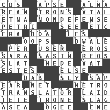 ACROSS 1. Music discs 4. Domed church section 8. _ mater 12. 480, 500 or 516 sheets of paper 14. Metal shackles 16. Small bottle 17. Inactive volcano in Sicily 18. Unrelated to defense, as in spending 20. _ dish (used to culture cells) 22. Perceive with the eye 23. And so on (abbr.) 24. Epoch 25. ___ good deed 28. French article 30. I made a mistake 31. A sleeping potion; an opiate (poet.) 35. For each 37. One who uses or employs something 40. Greek god of love 41. "Two Mules for Sister ____" 42. Indian antelope 44. Vintage cars 45. Narrow board 46. Ancient Persian 47. Large container 48. _____ Park, CO 50. Otherwise 52. Apply (a substance) by light strokes 54. Wily 55. Plant excrement 58. Hearing organ 61. Fish or hair follower 63. Paris' subway 65. Interpreter 70. Put down 71. Wig 72. Marketplace scale 73. Volcanic refuse 74. At sea 75. Double curve, resembling the letter S 76. Compass dir. DOWN 1. Streamer paper 2. Prevent from occurring 3. Before Barbara or Clara 4. The 18th letter of the Arabic alphabet 5. Adept person 6. Boy, to dad 7. Extremities 8. "___ Maria" 9. Actor's bit 10. Vertical spar for supporting sails 11. Actor Baldwin 13. Make imperfect 15. Stitch closed the eyes of (a falcon) 19. Nourish 21. Wedding promise 26. Musical composition 27. Indian state 29. Turn aside suddenly 30. Spoke pompously 32. Length times width 33. Spoils 34. Double-curved letter 35. Friends 36. Part of Q.E.F. 38. Compass dir. 39. Amusement-park features 41. Compass dir. 43. 1994 drama film starring Jodie Foster 49. Without 51. Symbol (abbr.) 53. Waist strap 55. Having lost freshness 56. Believer in; advocate of (suffix) 57. Plash 58. Singer James 59. Ancient Greek god of war 60. Assign a rank or rating to 62. Pacific island yam 64. Raised railways 66. Teachers' org. 67. Coat; cloak 68. Single 69. Portuguese money of account (variant)