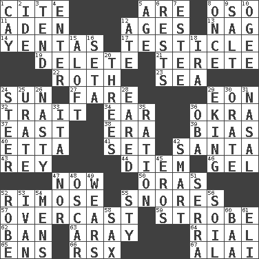 ACROSS 1. Quote 5. "We ___ not amused" (Victoria) 8. Bear (Spanish) 11. Arabian gulf 12. Eons 13. Tired old horse 14. Gossips 17. A testis 19. Erase 21. Cigar-shaped 22. Writer of Portnoy's Complaint (1969) 23. Ocean 24. Player for Phoenix 27. Conductor's collection 29. Period of immesurable duration 32. Distinguishing feature 34. Ewer handle 36. Gumbo ingredient 37. Compass direction 38. Period 39. Prejudice 40. Singer James 41. Arrange properly for use 42. Before Barbara or Clara 43. Marina Del _, California 44. South Vietnam president (1954) 46. Set 47. Immediately 50. Mouths or openings 52. Full of chinks, cracks, or crevices 55. Sounds asleep 57. Cloudy 59. Disco prop 62. Bar 63. Like ___ of sunshine 64. Monetary unit of Yemen 65. Followers of ems 66. Acura sports coupe 67. Jai _ DOWN 1. Island 2. Binary compound 3. Be inclined (to) 4. Keyboard key 5. Personal question 6. Musical pauses 7. First name in cosmetics 8. At one time in the past 9. Table seasoning 10. Double curve, resembling the letter S 12. Had dinner 15. Upward 16. Bristle 18. Lyricist Gershwin 20. Trios 24. Navigate 25. A salt of uric acid 26. Characterized by obscenity 28. Having ears or earlike features 29. Supplementing with great effort 30. Declaim 31. Rhinal 33. Call ___ day 35. Food allowance for one day 36. Chief or king in Benin or Nigeria 42. Don Adams' spy role 45. Greek god of love 47. Not either 48. Motion picture award 49. Erodes 51. Father Junipero _ 52. Loose flowing garment 53. "Terrible" tsar 54. Not women's 55. Filthy place 56. The visible part of the earth's surface 58. Saxophone 60. Sound made by sheep 61. Connecticut Ivy Leaguer