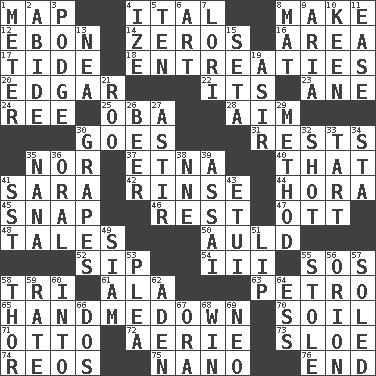 ACROSS 1. Atlas unit 4. Slanted text style (abbr.) 8. Cause to be 12. Inky black, to poets 14. Nothings 16. Type of rug 17. Periodic rise and fall of the sea level 18. Pleas 20. _ Allan Poe 22. It is 23. A saturated hydrocarbon 24. To riddle 25. Chief or king in Benin or Nigeria 28. Direct toward a target or goal 30. Travels 31. Musical pauses 35. Not either 37. Inactive volcano in Sicily 40. Not this but _ 41. "Two Mules for Sister ____" 42. Remove soap 44. Israeli folk dance 45. Fastener 46. Remainder 47. Baseball player Mel 48. Stories 50. Old (Scot.) 52. Small drink 54. One more than two 55. Distress signal 58. Three (prefix) 61. Insect wing 63. Stone: prefix 65. Sleeping bag shop? 70. Land 71. "Beetle Bailey" pooch 72. Nest on high 73. A type of plum 74. Vintage cars 75. Billionth: prefix 76. Conclude DOWN 1. Distance measurement 2. Tolerate 3. Porridge 4. Ending with capital 5. Nine, plus one 6. Tate display 7. Australian parrot (variant) 8. Floor protector 9. Operatic vocal solo 10. Peachy ____! 11. Comfort 13. Teachers' org. 15. Bristle 19. SW Saudi Arabia district 21. Friend of Pooh 26. Fermented drink made from hops 27. Moving or stirring 29. Mode 30. Raisin fruits 32. Went for two points 33. Small pie 34. R.R. building 35. Nanny 36. Taken by mouth 38. Compass dir. 39. Slender Brazilian palm 41. Fast jet (abbr.) 43. Needle case 49. Thailand, formerly 51. Mouth edge 53. Entreaty 55. Took without asking 56. Greek mythologigal hunter 57. Having a sole or soles 58. Son of Odin 59. Pace 60. To the inside or interior of 62. Arabian gulf 64. Double-curved letter 66. Two (Sp.) 67. Mouth or opening 68. Victory 69. Modern: prefix