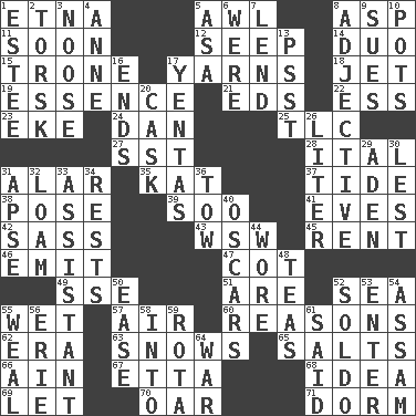 ACROSS 1. Inactive volcano in Sicily 5. Leather borer 8. Cleo's killer 11. Within a short period 12. Ooze 14. Superhero pair 15. Heavy duty weighing machine 17. Tall tales 18. Passenger plane 19. Substance 21. Begley and Asner 22. Double-curved letter 23. Supplement with great effort 24. One of the 12 tribes of Israel 25. Affectionate concern, for short 27. Fast jet (abbr.) 28. Slanted text style (abbr.) 31. Having or resembling wings 35. Krazy ___ of comics 37. Periodic rise and fall of the sea level 38. Introduce or present, as a question 39. "Barney Miller" actor Jack 41. Nights before holidays 42. Backtalk 43. Compass dir. 45. Monthly bill 46. Send forth 47. Small bed 49. Compass dir. 51. "We ___ not amused" (Victoria) 52. Ocean 55. Soggy 57. Wind 60. Thinks logically 62. Epoch 63. Overwhelms 65. Table seasonings 66. The 18th letter of the Arabic alphabet 67. Singer James 68. It may be bright or harebrained 69. Allow 70. Rowing implement 71. Dormintory (informal) DOWN 1. First name in cosmetics 2. Cod relative 3. Trap for birds or small mammals 4. Singer Murray 5. White ___ sheet 6. We are 7. Grant temporary use of 8. Descriptive word 9. Takes to court 10. Cooking vessels 13. Inconspicuous attention getter 16. Extremities 17. Gossips 20. Keg 26. 61 cubic inches 29. An important port of Yemen 30. For fear that 31. Domed church section 32. Rich soil 33. Helper 34. Musical pauses 36. Pull behind 40. Motion picture awards 44. Had on 48. Beverages made from leaves 50. Comfort 52. Twentieth part of a lira 53. Keyboard key 54. Indian state 55. Welt 56. 4th largest of the Great Lakes 58. To the inside or interior of 59. Round or rotation of duties 61. Expressed in words 64. Armed conflict
