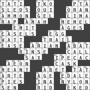 ACROSS 1. Jacques of French films 5. Ring climax 8. Parent Teacher Assoc. 11. Bobsleighs 13. Fr. "Yes" 14. Northwest Algerian city 15. ID or VA city 16. Set 17. Pale green bean 18. Hit sharply and swiftly 19. Nanny 21. Klaipeda city 22. Give off 24. Matures 25. Artist's stands 27. Oval reproductive body of a fowl 29. Electrical Unit 30. Hang back 32. Relaxation 33. Believer in; advocate of (suffix) 35. Blind as ____ 39. Wash lightly 41. Give a ring to 42. Saxophone 43. Medicinal drug used to evoke vomiting 45. Period of immesurable duration 48. Keg 49. Intended 50. Collude with 52. Make lace 55. Johnson of "Laugh-In" 56. Personal question 57. Peak District village in England 59. Sliced desserts 60. _ tizzy (2 wds.) 61. High-strength synthetic material 62. Elected rep. 63. To free from 64. Supplemented with great effort DOWN 1. Russian ruler of old 2. _ mater 3. Storms 4. Wedding promise 5. Ancient Roman robe 6. Malaysian steamed pastry 7. Lubricate 8. A-one 9. Domesticates 10. Of or related to the anus 12. Slow-paced one 14. Cassini of fashion 20. Mountains (abbr.) 21. Wise men 23. Distance measurement 25. She-sheep 26. American Automobile Association (abbr.) 27. Epoch 28. Separate the seeds from cotton 30. Make a knot 31. Shoestrings 33. Santa ___, CA 34. Acura sports coupe 36. Sass 37. Wing 38. Affectionate concern, for short 40. Is not 43. Frozen water 44. Eucharist need 45. Nest on high 46. Eroded 47. Washington bills 49. Atlas contents 50. Hindu god of fire 51. Necklace unit 53. Medicinal plant 54. Look after 56. Wind 58. Color