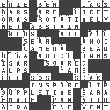 ACROSS 1. 4th largest of the Great Lakes 5. Benjamin's nick name 8. Fails to keep up a pace 12. Taverns 13. "We ___ not amused" (Victoria) 14. It is permitted: Lat. 15. Mouths or openings 16. Happening in regular succession 19. Fish or hair follower 20. Refrain by choice 21. Vintage cars 23. Had dinner 24. Everything 27. Burn superficially 30. Mine, in Marseilles 31. Device for capturing images 34. Necklace unit 35. Port city in Latvia 38. Remain 40. Lodging establishments 41. Austrian river, tributary to the Danube 42. Flew 44. High mountains 45. Female horse 46. Area sheltered from the wind 47. Distress signal 50. Neighbor of Neb. 53. Heighten or intensify 57. Mouth edge 59. Supplementary 63. "Two Mules for Sister ____" 64. Related on the mother's side 65. Baking dish 66. Use a spoon 67. Opera by Verdi 68. Compass dir. 69. Gone DOWN 1. Inky black, to poets 2. Less widely known 3. Feeling or showing extreme anger 4. Double-curved letter 5. Sharp remark 6. Greek god of love 7. Remaining after all deductions 8. 54 in ancient Rome 9. Adept person 10. Set 11. Filthy place 14. Actor's bit 17. Auto club (abbr.) 18. Teat (slang) 20. At sea 22. Motion picture awards 24. So be it 25. Grant temporary use of 26. Hats (slang) 28. Nanny (var.) 29. Confederate soldiers (slang) 30. Stayed 32. River (Sp.) 33. First of billions? 35. Monetary unit of Yemen 36. Capri or Wright 37. Open wide 39. Period 43. Celtic language 47. Filth; sediment 48. Single 49. Fast jet (abbr.) 51. Having winglike extensions 52. Japanese brewing company 54. Corncob 55. _ the terrible 56. French philosopher Descartes 58. Role in a play 59. Ocean 60. Corn or form start 61. Groovy apt. 62. Parent Teacher Assoc. 63. Compass dir.