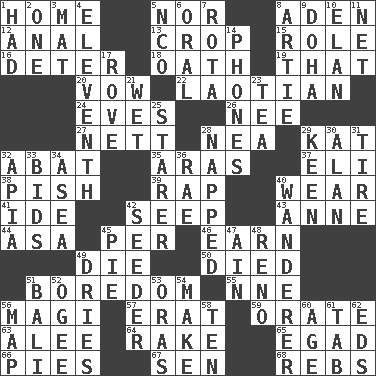 ACROSS 1. Residence 5. Not either 8. An important port of Yemen 12. Of or related to the anus 13. Riding implement 15. Hero or heavy, e.g. 16. Prevent from occurring 18. Pledge 19. Not this but _ 20. Promise 22. Of or relating to Laos or its people 24. Nights before holidays 26. Born 27. Remaining after all deductions 28. Teachers' org. 29. Krazy ___ of comics 32. Blind as ____ 35. Caspian sea tributary 37. Biblical high priest 38. Expression of disdain 39. Reproach for some lapse or misdeed 40. Erode 41. Binary compound 42. Ooze 43. Queen of England 1702-14 44. White ___ sheet 45. For each 46. Merit 49. Expire 50. Passed on 51. Mood resulting from idleness 55. Compass dir. 56. Wise men 57. Part of Q.E.F. 59. Speak pompously 63. Toward shelter 64. Libertine 65. Mild oath 66. Sliced desserts 67. Elected rep. 68. Confederate soldiers (slang) DOWN 1. Possessed 2. Single 3. Floor protector 4. Veterans Day date 5. Non-commissioned officer (abbr.) 6. Taken by mouth 7. Round or rotation of duties 8. Nick name for Arthur 9. Capital of the state of Qatar 10. Style 11. Fish or hair follower 14. Gives a jingle 17. Be footloose 21. Soggy 23. Afternoon social gathering 25. A viewer who gazes fixedly 28. Slept 29. Peachy ____! 30. Actor Alda or Thicke 31. Become fatigued 32. Capital of Western Samoa 33. Auction offers 34. Toward the sea 36. Actress Charlotte 40. Nomad 42. Sowing specialist 45. Sliced dessert 47. The 18th letter of the Arabic alphabet 48. Former U.S. Attorney General Janet 49. Frees from moisture 51. Indonesian resort city 52. Double curve, resembling the letter S 53. Mouths or openings 54. Create 56. Atlas unit 58. "___ Little Indians" 60. Ripen 61. Keyboard key 62. Begley and Asner