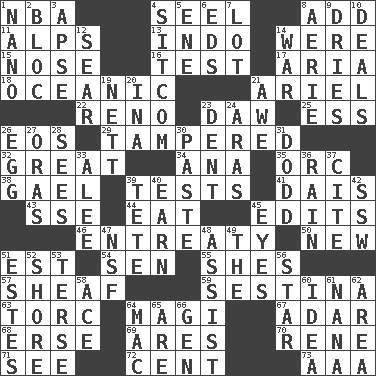 ACROSS 1. Basketball assoc. 4. Stitch closed the eyes of (a falcon) 8. Say or write further 11. High mountains 13. Southeast Asian peninsula 14. Past tense of be (plural) 15. Olfactory organ 16. Trial 17. Roberta Peters solo 18. Pertaining to the sea 21. Satellite of Uranus 22. Former U.S. Attorney General Janet 23. Obsolete 25. Curvy letter 26. Greek goddess of the dawn 29. ________ with (broke a safety seal) 32. Relatively large 34. Santa ___, CA 35. The grampus (Milton) 38. Highlander 39. Trials 41. Raised platform 43. Compass dir. 44. Ingest 45. Prepares for publication 46. Plea 50. ___ Haven, CT 51. Eastern Standard Time (abbr.) 54. Elected rep. 55. "______ My Girl" (Turtles hit) 57. Bundle of cut stalks of grain 59. French poetic form 63. Torque (variant) 64. Wise men 67. The sixth month of the Jewish calendar 68. Celtic language 69. Ancient Greek god of war 70. French philosopher Descartes 71. Perceive with the eye 72. Penny 73. American Automobile Association (abbr.) DOWN 1. Billionth: prefix 2. Alliance 3. Domed church section 4. "Cheers" or "Ellen" 5. Compass dir. 6. Begley and Asner 7. Car dealer's back yard 8. Nest on high 9. Frees from moisture 10. Allots cards 12. Scorch 14. Armed conflict 19. Remaining after all deductions 20. _ tizzy (2 wds.) 21. Deep reverence 23. Scratch 24. Caspian sea tributary 26. Ovum 27. Mouths or openings 28. Observes 30. Thick mixture 31. Texas town _ City 33. Toward shelter 36. Water falling in drops from the sky 37. Quote 39. False hair 40. Merit 42. Compass dir. 45. Snake ____ (dice throw) 47. Overdraft (abbr.) 48. Help 49. Definite Article 51. _____ Park, CO 52. Dinah or Pauly 53. Laconic 56. Play the lead 58. Adept person 60. It may be bright or harebrained 61. Nanny 62. Length times width 64. Apple computer (short form) 65. "We ___ not amused" (Victoria) 66. Commissioned military rank (abbr.)