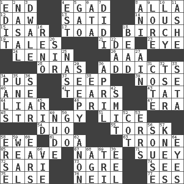 ACROSS 1. Conclusion 4. Mild oath 8. Silent film actress Nazimova 12. Fool 13. Suttee (variant) 14. Horse sense 15. Austrian river, tributary to the Danube 17. Frog relative 18. A tree used for making furniture 19. Falsehoods 21. Binary compound 23. Sight organ 24. Soviet premier 1918-24 26. Auto club (abbr.) 28. Mouths or openings 30. Inveterate users 34. Festering 37. Ooze 39. Characteristic smell of wine 40. One (Scot) 41. Pulls apart 43. Make lace 44. One who doesn't tell the truth 46. Demure 47. Epoch 48. Slender, wiry 51. Louse (plural) 54. Superhero pair 55. Cod relative 58. She-sheep 61. ___ good deed 63. Marketplace scale 65. Rob, plunder, or pillage 67. Nathan's nickname 71. Chop _ 72. Indian skirt 73. Legendary monster 74. Perceive with the eye 75. Otherwise 76. Famous astronaut Armstrong 77. Double-curved letter DOWN 1. Prepare for publication 2. Relating to the nose 3. A sleeping potion; an opiate (poet.) 4. Eastern Standard Time (abbr.) 5. E Mali city 6. "One Day ___ Time" 7. "You Light Up My Life" star Conn 8. Cuckoo 9. Old wives' tales, e.g. 10. "I Love _" 11. American tennis player Robert 16. Former U.S. Attorney General Janet 18. Necklace unit 20. Title for a knight 22. Male parent 25. Political cartoonist Thomas 27. The 18th letter of the Arabic alphabet 29. Not well drained, as in land 30. Showery time 31. ____ d'Azur (French Riviera) 32. Russian ruler of old 33. Bristle 34. Friends 35. A single undivided whole 36. Singe 38. Hearing organ 42. Stricken, poetically 45. To free from 49. Unadorned 50. Thick or sticky substance 52. Small bed 53. Blunders 56. Boozer 57. Leg joints 58. Celtic language 59. Welt 60. Hearing organs 62. At once, immediately (arch.) 64. Snake ____ (dice throw) 66. Compete 68. Grow older 69. Three (prefix) 70. Snakelike fish