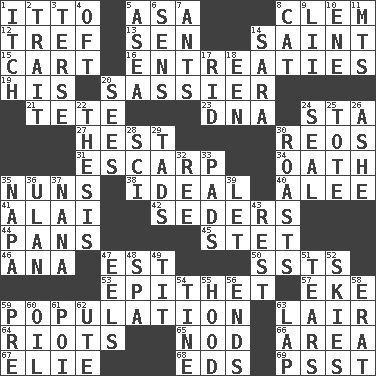 ACROSS 1. "Tell ____ the Marines!" 5. White ___ sheet 8. Clement's nick name 12. Unclean, religiously 13. Elected rep. 14. Virtuous person 15. Heavy open wagon 16. Pleas 19. Part of HMS, perhaps 20. More impudent 21. False hair 23. Heredity factor (abbr.) 24. R.R. building 27. Behest 30. Vintage cars 31. Fortification 34. Pledge 35. Religious women 38. Perfect 40. Toward shelter 41. Mountain range southwest of Kyrgyzstan 42. Spring feasts 44. Zero-star reviews 45. Proofreading order 46. Santa ___, CA 47. Eastern Standard Time (abbr.) 50. Fast planes 53. Curse 57. Make supply last 59. Census information 63. Den 64. Debaucheries 65. Lower and raise head in agreement 66. Type of rug 67. Writer Wiesel 68. Begley and Asner 69. Inconspicuous attention getter DOWN 1. Hankering 2. Distinguishing feature 3. Laconic 4. Often (poetically) 5. Toward the sea 6. Elected reps. 7. Pismires 8. Domesticated feline 9. Cards in a Roman deck? 10. Compass dir. 11. Mountains (abbr.) 14. "Two Mules for Sister ____" 17. To free from 18. Car or cant ending 20. Perceives with the eye 22. College paper 24. Lick closed 25. Lug 26. American tennis player Robert 28. _-fi 29. Small boys 30. Ridicules or criticizes harshly 32. To riddle 33. Groovy apts. 35. California wine valley 36. Uhlan (variant) 37. Nanny 39. Allow 43. Remainder 47. Snakelike fish 48. Health resort 49. Teat (slang) 51. Separates forcefully 52. Atmospheres 54. Prong on a fork 55. Parka part 56. Extremities 58. Part of Q.E.F. 59. Before (prefix) 60. Lubricate 61. Luau course 62. Shoshoni 63. Pet locale