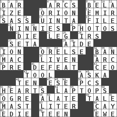ACROSS 1. Long, evenly shaped piece 4. Arches 8. Actor Lugosi 12. Ending with capital 13. Greek mythologigal hunter 14. Independent ruler or chieftain 15. Backtalk 17. National forest in Provo, Utah 18. Do some clerical work 19. Simpletons 21. Pictures 23. Expire 24. Part of a journey 26. Big collection agency 27. Bristle 28. Assistant 30. Electrically charged atom 31. Threatening words 34. Forbid 37. Apple computer (short form) 38. Make or become more lively 39. Curve 40. Before (prefix) 41. Outscore 42. Corporate head (abbr.) 43. Utensil 44. "____ silly question..." 46. Nine, plus one 47. Compass dir. 50. Personal Computers (abbr.) 51. Centers of feelings and intuitions 54. Portable computers 57. Legendary monster 58. Having winglike extensions 60. Story 62. Vertical spar for supporting sails 63. 61 cubic inches 64. Island 65. Singer Brickell 66. Adolescent 67. She-sheep DOWN 1. Twice 2. Muslim summons to prayer 3. Dwelling 4. Satellite of Uranus 5. Remove soap 6. Small bed 7. Fastener 8. Prior to 9. Gives off 10. _ and Stitch 11. Ancient Greek god of war 13. Fr. "Yes" 16. In a ____ (agitated or irritated) 20. Teachers' org. 22. Flintstone garb 25. An organ shaped like a helmet 27. Fly high 29. Is not 30. Naughty child 31. Butter sub 32. Firearm 33. Night before a holiday 34. Keyboard key 35. Length times width 36. Non-commissioned officer (abbr.) 41. Do not 43. Cigar-shaped 44. Fitting 45. Highlander 46. Tarsus (plural) 48. Chalkboard 49. Eroded 51. Residence 52. Mild oath 53. Table seasoning 55. For each 56. Cole _ (cabbage dish) 59. Untruth 61. Sight organ