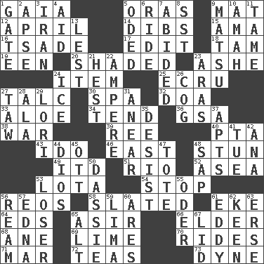ACROSS 1. Greek goddess of the earth (variant) 5. Mouths or openings 9. Floor covering 12. Showery time 14. Claim 15. Nanny (var.) 16. Sadhe (variant) 17. Prepare for publication 18. Scottish cap 19. Car or cant ending 20. Cast a shadow over 23. American tennis player Robert 24. A whole individual unit 25. Shade of tan 27. Baby powder 30. Health resort 32. ___ good deed 33. _ vera 34. Watch over 36. Girls' org. (abbr.) 38. Armed conflict 39. To riddle 40. Parent Teacher Association (abbr.) 43. Wedding promise 46. Compass direction 48. Make senseless or dizzy 49. It would 51. River (Sp.) 52. Toward the sea 53. Globular water bottle used in Asia 54. Obstruct or block passage 56. Vintage cars 58. Scheduled 61. Make supply last 64. Begley and Asner 65. SW Saudi Arabia district 66. A person who is older than you are 68. A saturated hydrocarbon 69. Welles in "The Third Man" 70. Amusement-park features 71. Make imperfect 72. Afternoon social gatherings 73. Unit of force DOWN 1. Yard entry 2. Domed church section 3. SW Asia republic 4. Assist 5. Wrote a lyric poem 6. Travel on an animal 7. Tolerated 8. Fast jet (abbr.) 9. Taiwanese island in East China Sea 10. Wet nurse 11. Docile 13. For fear that 21. Command 22. Electrical Unit 23. Caspian sea tributary 24. Frozen water 26. Gear tooth 27. The 23rd letter of the Hebrew alphabet 28. Wing 29. Australian parrot (variant) 31. Approach 35. Stop 37. Flats, for short 41. Third day of the wk. 42. Santa ___, CA 44. "Vaya con ____" 45. Baseball player Mel 47. Carryall 48. Plant excrement 50. Hyrax 53. Failure 55. River in Europe 56. 480, 500 or 516 sheets of paper 57. Pulitzer Prize-winning author Ferber 59. Pale green bean 60. Ancient Greek god of war 61. Whirlpool 62. Peachy ____! 63. Celtic language 65. Keyboard modifier key 67. Flaplike covering