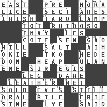ACROSS 1. 90 degrees 5. Before (prefix) 8. Israeli folk dance 12. Louse (plural) 13. Religious group 15. Ancient Greek god of war 16. From or relating to Ireland 18. Edible starchy tuberous root 19. Desk light 20. Small child 22. Noisy, rowdy, vocal (Spanish) 24. "If ____ say so..." 26. French article 27. ____ d'Azur (French Riviera) 28. Elected rep. 29. E Mali city 32. Place where flour is made 35. Table seasoning 37. Direct toward a target or goal 38. Migrant worker of the '30s 39. Ring climax 40. Ancient Persian 41. Spanish title 42. Pile 43. ____ Bator 44. Compass dir. 45. Title for a knight 46. Armor plate that protects the chest 49. Part of a journey 50. Have the gumption 51. Cordwainer's material 55. Fish or hair follower 56. Exchanged or delivered for money 57. Nights before holidays 59. Not moving 63. Spoken 64. Cause heat under the collar 65. One of the Great Lakes 66. Trig term 67. Potassium hydroxide 68. Expressed in words DOWN 1. Biblical high priest 2. Atmosphere 3. _-fi 4. One of the two male reproductive glands 5. Pacific Standard Time (abbr.) 6. Stern 7. Shade of tan 8. Saint headwear 9. Mouths or openings 10. San ____ (Riviera town) 11. Viper 14. Rest room 17. Same (prefix) 21. Make lace 23. Lair 25. Last past 28. Inclined 29. Highlander 30. Opera by Verdi 31. Sign of something about to happen 32. Method 33. Image 34. Actor's bit 36. Alias (abbr.) 40. French bagpipes 42. Having greater elevation 45. Put into a specified state 47. Separate the seeds from cotton 48. Angers 49. Dipping utensil 51. Australian parrot (variant) 52. Enthusiasm 53. Tending to cause great harm 54. Trust 56. Distress signal 58. Perceive with the eye 60. Retirement account (abbr.) 61. Cards in a Roman deck? 62. Directed
