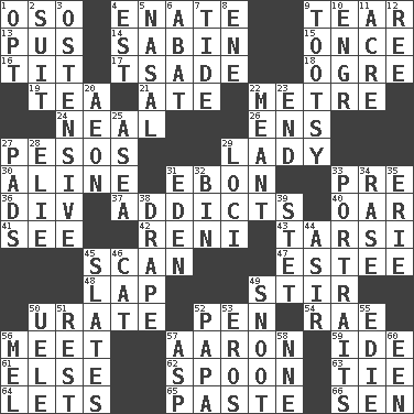 ACROSS 1. Bear (Spanish) 4. Maternal 9. Separate forcefully 13. Purulenc 14. Unit of acoustic absorption 15. Single time 16. Teat (slang) 17. Sadhe (variant) 18. Legendary monster 19. Afternoon social gathering 21. Had dinner 22. Distance measurement (Brit.) 24. Be tempered by heat 26. Followers of ems 27. Mexican monetary units 29. Kenny Rogers chart-topper in '80 30. Place in a line 31. Inky black, to poets 33. Before (prefix) 36. HTML Container Element 37. Inveterate users 40. Boat paddle 41. Perceive with the eye 42. Painter Guido (1575-1642) 43. Tarsus (plural) 45. Glance over 47. First name in cosmetics 48. Infant locale 49. Move through with a circular motion 50. A salt of uric acid 52. Writing instrument 54. Actress Charlotte 56. Confront 57. Composer Copland 59. Binary compound 61. Otherwise 62. Soup utensil 63. Neckwear 64. Allows 65. Thick mixture 66. Elected rep. DOWN 1. Choose 2. Set of matching outer garments 3. Clearly or manifestly demonstrative 4. Eastern Standard Time (abbr.) 5. Rhinal 6. Blind as ____ 7. Event that recurs at intervals 8. Compass dir. 9. A girl or young woman (variant) 10. Engineer (abbr.) 11. Measure of real estate 12. To sift 20. Period of immesurable duration 22. Intended 23. Conclusion 25. At sea 27. Writing tablets 28. Writer Wiesel 29. Locales 31. Locale of original sin 32. Storage container 33. Likenesses of persons 34. Raze (variant) 35. 4th largest of the Great Lakes 38. Window treatment 39. Proofreading order 44. SW Saudi Arabia district 45. Chalkboards 46. Domesticated feline 49. Snout, nose 50. Ubangi River tributary 51. Take ten 52. Dad 53. Greek god of love 55. Singer Brickell 56. Cartoonist voice _ Blanc 57. Cleo's killer 58. Compass dir. 60. Car or cant ending