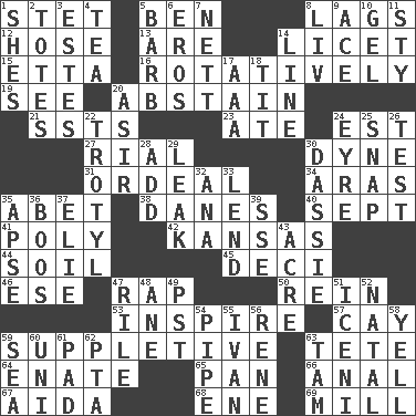 ACROSS 1. Proofreading order 5. Benjamin's nick name 8. Falls behind 12. Stockings 13. "We ___ not amused" (Victoria) 14. It is permitted: Lat. 15. Singer James 16. Rotating or pertaining to rotation 19. Perceive with the eye 20. Refrain by choice 21. Fast planes 23. Had dinner 24. Eastern Standard Time (abbr.) 27. Monetary unit of Yemen 30. Centimeter-gram-second unit of force 31. Severe or trying experience 34. Ancient river in northeast Turkey 35. Collude with 38. Natives or inhabitants of Denmark 40. Back-to-school mo. 41. Much (prefix) 42. Sunflower state 44. Land 45. Tenth: prefix 46. Compass dir. 47. Hit sharply and swiftly 50. It's straight from the horse's mouth 53. Stimulate to action 57. Island 59. Supplying deficiencies 63. False hair 64. Related on the mother's side 65. Baking dish 66. Of or related to the anus 67. Opera by Verdi 68. Compass dir. 69. Place where flour is made DOWN 1. "______ My Girl" (Turtles hit) 2. Lugs 3. _____ Park, CO 4. Afternoon social gathering 5. Sharp remark 6. Greek god of love 7. Remaining after all deductions 8. 54 in ancient Rome 9. Adept person 10. Set 11. Filthy place 14. Actor's bit 17. Auto club (abbr.) 18. Teat (slang) 20. SW Saudi Arabia district 22. Trinitrotoluene 24. Jane of fiction 25. Fastener 26. Trial 28. Find the sum of 29. Path through which fluid escapes 30. Hyrax 32. Santa ___, CA 33. Grant temporary use of 35. Domed church section 36. Expressions of contempt or scorn 37. Writer Wiesel 39. Compass dir. 43. Land measure 47. Cause heat under the collar 48. A saturated hydrocarbon 49. Pacific Standard Time (abbr.) 51. Ancient Celtic tribe of eastern Britain 52. Brizilian seaport 54. Corncob 55. _ the terrible 56. French philosopher Descartes 58. Shout 59. Ocean 60. Corn or form start 61. Groovy apt. 62. Parent Teacher Association (abbr.) 63. Scottish cap