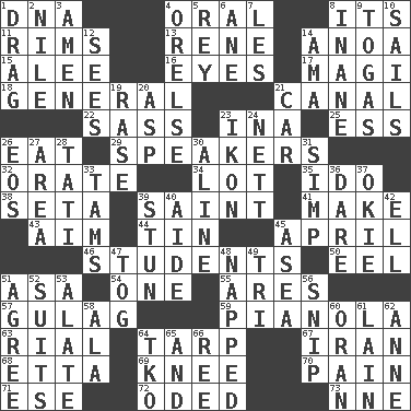 ACROSS 1. Heredity factor (abbr.) 4. Of the mouth 8. ___ a Wonderful Life 11. Basketball hoops 13. French philosopher Descartes 14. Small Philippine buffalo 15. Toward shelter 16. Snake ____ (dice throw) 17. Wise men 18. Commissioned military rank 21. Lessep's creation 22. Backtalk 23. _ tizzy (2 wds.) 25. Double-curved letter 26. Consume 29. Orators 32. Declaim 34. Car dealer's back yard 35. Wedding promise 38. Stalk of a moss capsule 39. Inhabitant of Heaven 41. Cause to be 43. Direct toward a target or goal 44. Metal container 45. Showery time 46. SAT takers 50. Snakelike fish 51. White ___ sheet 54. Single 55. Ancient Greek god of war 57. POW camp 59. Player piano 63. Monetary unit of Yemen 64. Canvas cover 67. SW Asia republic 68. Singer James 69. Leg joint 70. Ache 71. Compass dir. 72. Wrote a lyric poem 73. Compass dir. DOWN 1. To draw with force 2. "Death on the ____" 3. So be it 4. Threatening words 5. Marina Del _, California 6. One (Scot) 7. French article 8. Lacking in sense or substance 9. Ancient Roman robes 10. Moves on water 12. Observes 14. Nanny (var.) 19. To erase 20. Cleo's killer 21. Automobile 23. Visual representation of an object 24. Remaining after all deductions 26. Greek goddess of the dawn 27. Type of rug 28. Jacques of French films 30. Place in a line 31. Simple or foolish person 33. Scottish caps 36. Have the gumption 37. Migrant worker of the '30s 39. Make senseless or dizzy 40. Helper 42. Pipe bend 45. At sea 47. Coat; cloak 48. Slept 49. Three (prefix) 51. Match 52. Sets of matching outer garments 53. Having winglike extensions 56. Sever or remove by pinching or nipping 58. In the manner of 60. Northwest Algerian city 61. (Had) reclined 62. Queen of England 1702-14 64. Ring climax 65. Also 66. To sift