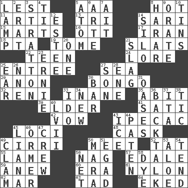 ACROSS 1. For fear that 5. Auto club (abbr.) 8. Being at a high temperature 11. Nick name for Arthur 13. Three (prefix) 14. Indian skirt 15. Shops 16. Baseball player Mel 17. SW Asia republic 18. Parent Teacher Assoc. 19. Heavy book 21. Narrow boards 22. Adolescent 24. Old wives' tales, e.g. 25. Main course 27. Ocean 29. At once, immediately (arch.) 30. Beat drum 32. Painter Guido (1575-1642) 33. Lacking in sense or substance 35. "This won't hurt ____!" 39. A person who is older than you are 41. Suttee (variant) 42. Promise 43. Medicinal drug used to evoke vomiting 45. Venues 48. Keg 49. High-altitude cloud 50. Rendezvous 52. Make lace 55. Unable to walk 56. Tired old horse 57. Peak District village in England 59. Afresh 60. Epoch 61. High-strength synthetic material 62. Spoil 63. Bit 64. Supplemented with great effort DOWN 1. Desk light 2. Part of Q.E.F. 3. Ski resort town in Vermont 4. Teat (slang) 5. Smallest unit of an element 6. Johnson of "Laugh-In" 7. Small island 8. Ethiopian city, capital of Harari 9. Speak pompously 10. Canisters 12. First name in cosmetics 14. Grain storage tower 20. Single 21. Volcanic refuse 23. Bert's buddy 25. Ewer handle 26. Compass dir. 27. Boy, to dad 28. Compass dir. 30. Oblong piece of solid material 31. Fertile tracts in a desert 33. Wedding promise 34. ___ Haven, CT 36. Sass 37. Call ___ day 38. Nervous spasm 40. 57 in ancient Rome 43. Frozen water 44. Eucharist need 45. Climbing, woody, usually tropical vines 46. Abalone 47. Group working together 49. Burrowing marine mollusk 50. Hindu Mythology: god of death 51. Mild oath 53. _ vera 54. Be inclined (to) 56. Fish or hair follower 58. Color