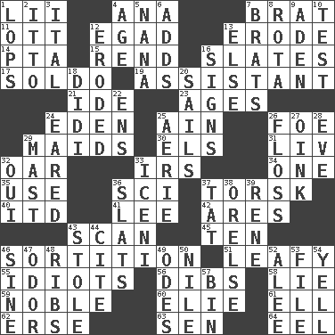 ACROSS 1. Cards in a Roman deck? 4. Santa ___, CA 7. Naughty child 11. Baseball player Mel 12. Mild oath 13. Wear away 14. Parent Teacher Association (abbr.) 15. Tear apart 16. Chalkboards 17. Twentieth part of a lira 19. Aide 21. Binary compound 23. Ripens 24. Paradise 25. The 18th letter of the Arabic alphabet 26. Enemy 29. Women servants 30. Raised railways 31. 54 in ancient Rome 32. Boat paddle 33. Big collection agency 34. Single 35. Purpose 36. _-fi 37. Cod relative 40. It would 41. Area sheltered from the wind 42. Ancient Greek god of war 43. Examine minutely or intensely 45. "___ Little Indians" 46. Conclusion 51. Like summer trees 55. Foolish or stupid persons 56. Rights 58. Falsehood 59. Having high moral qualities 60. Writer Wiesel 61. Pipe bend 62. Celtic language 63. Elected rep. 64. Snakelike fish DOWN 1. Chops off 2. "Tell ____ the Marines!" 3. Slanted text style (abbr.) 4. Personal question 5. Nanny 6. Does sums 7. Naughty children 8. Roll call or roster of names 9. Arabian gulf 10. Trial 12. Worn away 13. Otherwise 16. Public displays of written messages 18. "You Light Up My Life" star Conn 20. Travel by water 22. Followers of ems 24. Having ears or earlike features 25. Nest on high 26. Soft thread for cleaning between teeth 27. Pig sound 28. Night before a holiday 29. Vertical spar for supporting sails 32. Fr. "Yes" 33. Ancient Celtic tribe of eastern Britain 36. Narrow boards 37. Make lace 38. Threatening words 39. French philosopher Descartes 43. Took without asking 44. Quote 46. Trig term 47. Scent 48. Chest bones 49. Lyric poems 50. Mediterranean tributary 52. Toward shelter 53. Do some clerical work 54. Shout 57. Storage container