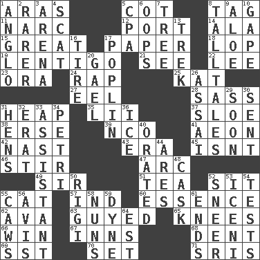ACROSS 1. Ancient river in northeast Turkey 5. Small bed 8. Label 11. Drug cop 12. Sweet dark-red dessert wine 14. Chicken ___ king 15. Relatively large 17. Some stationery 18. Trim (branches) 19. Small, flat, pigmented spot on the skin 21. Observe 22. Area sheltered from the wind 23. Mouth or opening 24. Reproach for some lapse or misdeed 25. Krazy ___ of comics 27. Snakelike fish 28. Backtalk 31. Pile 35. Cards in a Roman deck? 37. A type of plum 38. Celtic language 39. Non-commissioned officer (abbr.) 41. A really long time 42. Political cartoonist Thomas 43. Period 45. Is not 46. Disorderly outburst 47. Curve 49. Title for a knight 51. Beverage made from leaves 52. Be seated 55. Feline 57. Working for oneself (abbr.) 60. Core 62. Actress Gardner 63. Steadied 65. Leg joints 66. Victory 67. Taverns 68. Incision 69. Fast jet (abbr.) 70. Arrange properly for use 71. Indian titles of respect DOWN 1. White American of non-Hispanic descent 2. Less widely known 3. Sports stadium 4. Go away! 5. Accounting whiz (abbr.) 6. I made a mistake 7. Woody plant 8. Baron Munchausen's specialties 9. Medicinal plant 10. Stare wonderingly 13. Long journey 16. Become fatigued 17. Cotton for raincoats, e.g. 20. Highlander 26. Slender Brazilian palm 29. Within a short period 30. Posted 31. Coop moms 32. Part of Q.E.F. 33. Helper 34. _ dish (used to culture cells) 36. Frozen water 40. Declaimed 44. Ancient Greek god of war 48. Keg 50. Swiss mountan, "Queen of the Mountains" 52. Contemptuous expression 53. Ancient Celtic tribe of eastern Britain 54. Trials 55. Crow sounds 56. Opinion 58. Religious women 59. Centimeter-gram-second unit of force 61. Conclusions 64. Eastern Standard Time (abbr.)