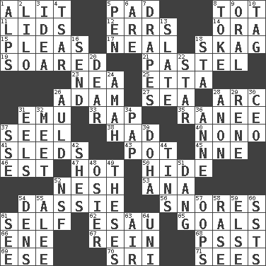 ACROSS 1. Set down 5. Groovy apt. 8. Small child 11. Flaplike coverings 12. Blunders 14. Mouth or opening 15. Entreaties 17. Be tempered by heat 18. Heroin 19. Flew 21. Soft color 23. Teachers' org. 25. Singer James 26. First man 27. Ocean 28. Curve 31. Australian flightless bird 33. Reproach for some lapse or misdeed 35. The wife of a rajah (variant) 37. Stitch closed the eyes of (a falcon) 38. Possessed 40. Words to Nanette 41. Bobsleighs 43. Plant holder 45. Compass dir. 46. Eastern Standard Time (abbr.) 47. Being at a high temperature 50. Flintstone garb 52. Soft 53. Santa ___, CA 54. Hyrax 56. Sounds asleep 61. Automatically 62. Son of Isaac 65. Finish lines 66. Compass dir. 67. It's straight from the horse's mouth 68. Inconspicuous attention getter 69. Compass dir. 70. _ Lanka 71. Observes DOWN 1. High mountains 2. _ and Stitch 3. The main thing one is thinking about 4. Russian ruler of old 5. Fenced enclosure 6. "We ___ not amused" (Victoria) 7. Window treatments 8. Puff or smoke 9. Spoken 10. Label 13. Schedule 16. Post 18. R.R. building 20. Letter starter 22. Play the lead 24. Housemaid 26. Old (Scot.) 28. Soon (poet.) 29. French philosopher Descartes 30. Corporate head (abbr.) 31. Snakelike fish 32. Rendezvous 34. Infant food 36. Queen of England 1702-14 37. Compass dir. 39. Capital of the state of Qatar 42. "______ My Girl" (Turtles hit) 44. Airtight sealed metal containers 48. Flexible twig of a willow tree 49. College papers 51. Mild oath, euphamism for damn 52. Science/research agcy. 54. Lairs 55. Toward shelter 57. I made a mistake 58. Raze (variant) 59. Otherwise 60. Fast planes 61. Perceive with the eye 63. Atmosphere 64. Single; one (prefix)